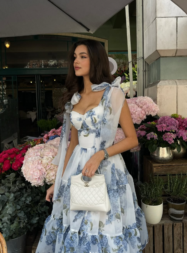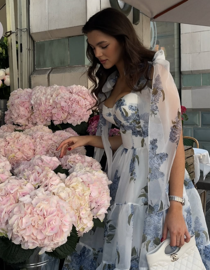 Blue Print Floral A Line Spaghetti Strap Tea Length Chiffon Homecoming Dress Cocktail Dress Outfits HZ1023