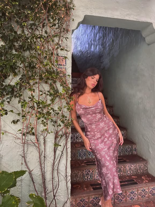 Dark Purple Sheath Spaghetti Strap Print Floral Satin Prom Dress Party Dress HZ1023