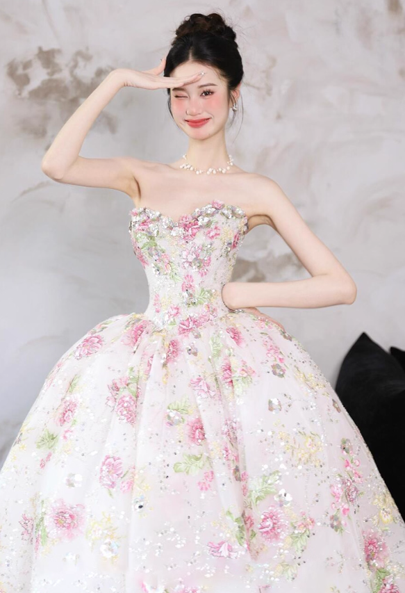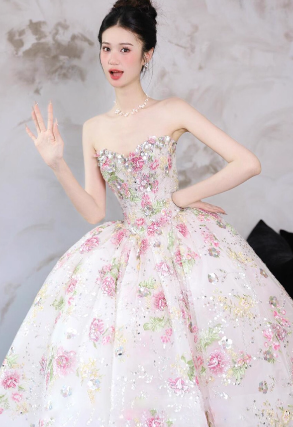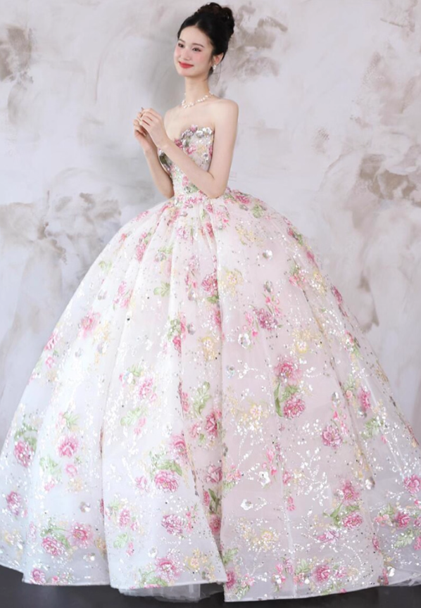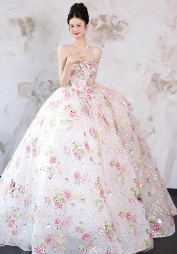 Exquisite Ball Gown Strapless Embroidery Floral Tulle Prom Dress 16th Birthday Dress HZ1023