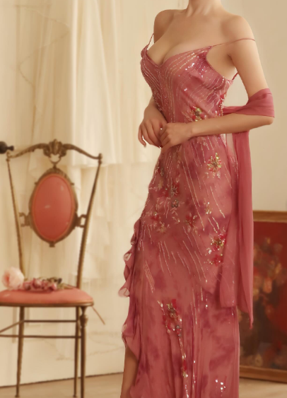 Retro Dreamy Mermaid Pink Print Floral Ruffle Chiffon Long Party Dress Evening Dress Date Dress HZ1023