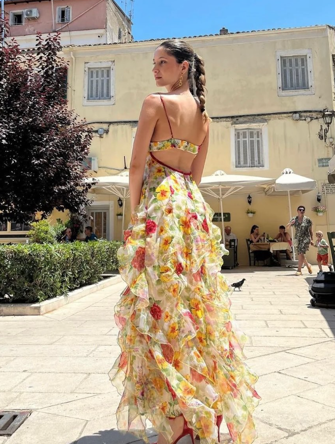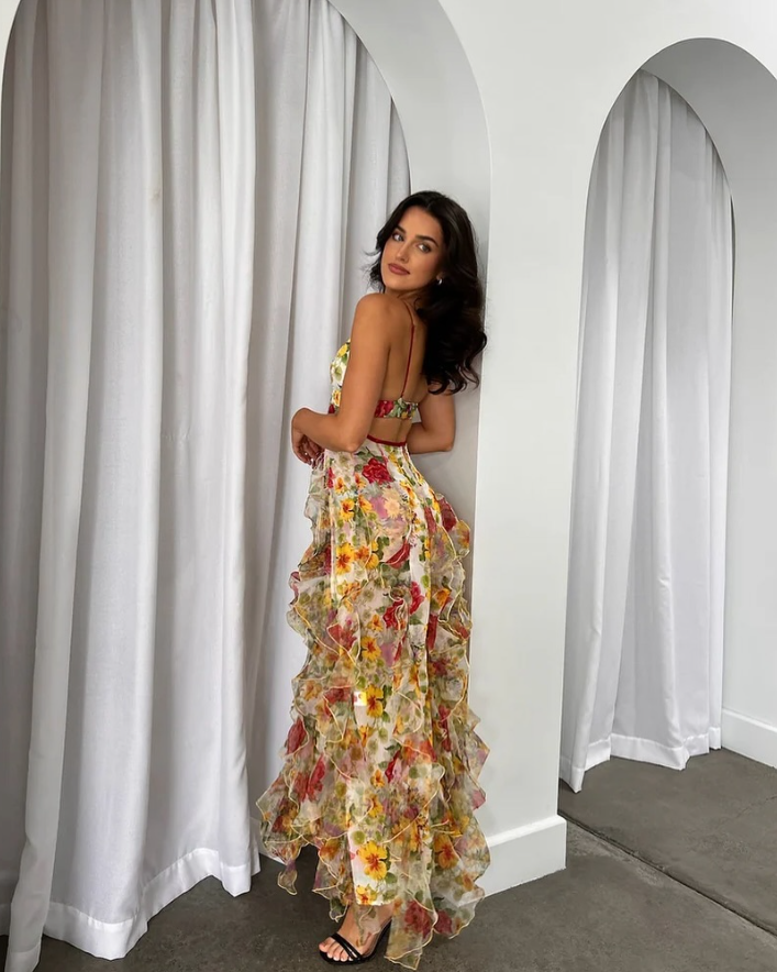 Stunning Print Floral A Line Straps Ruffle Chiffon Prom Dress Party Dress HZ1023