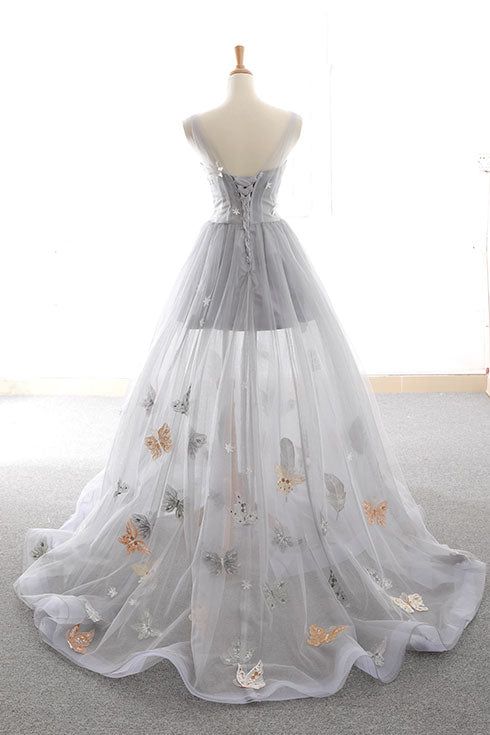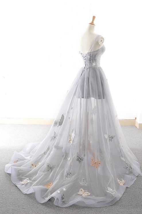 Gray A Line Sweetheart Appliques Tulle Long Prom Dress Evening Dress HZ1023