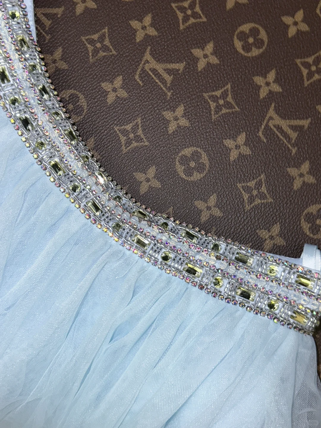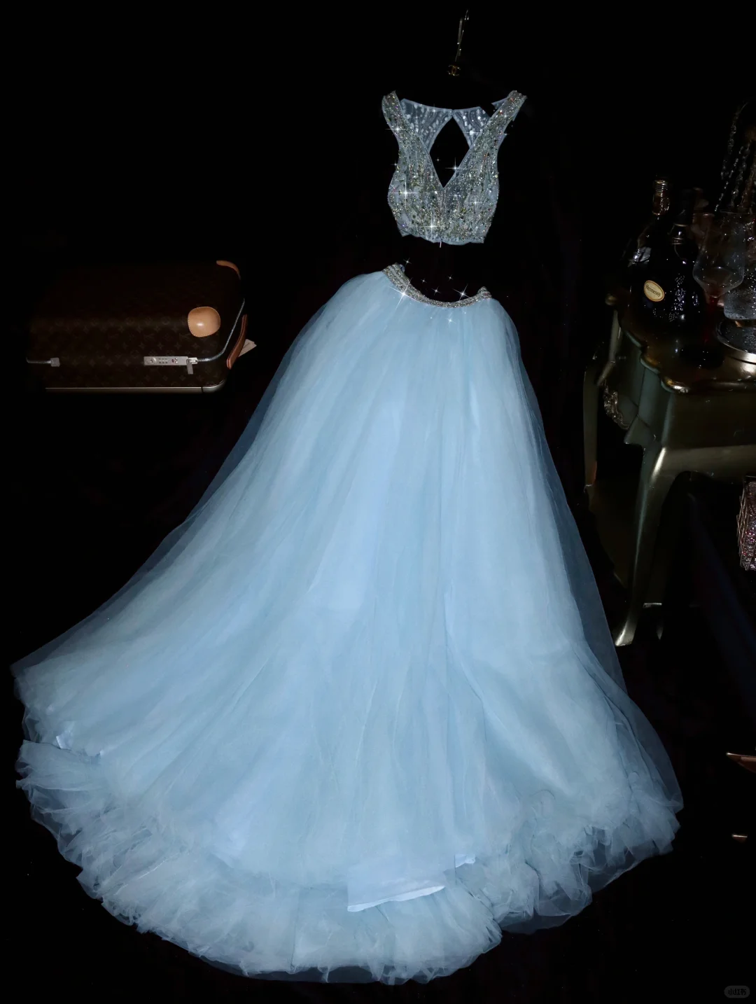 Shiny A Line V Neck Two Piece Beaded Baby Blue Tulle Long Prom Dress Evening Dress HZ1023