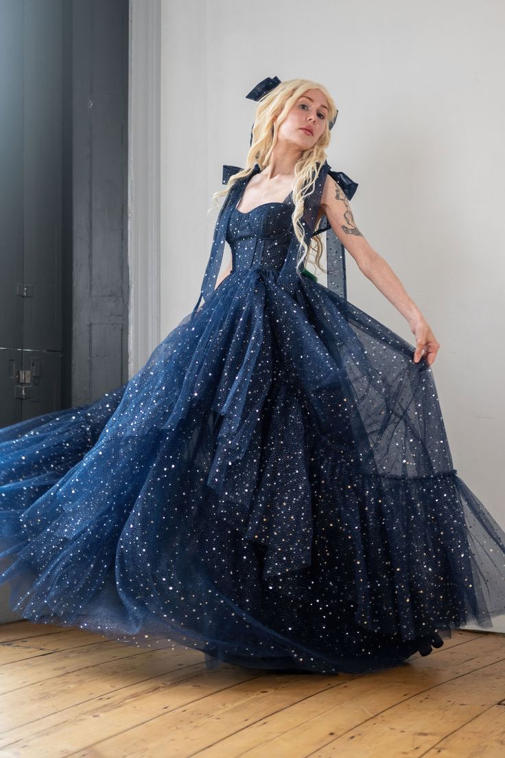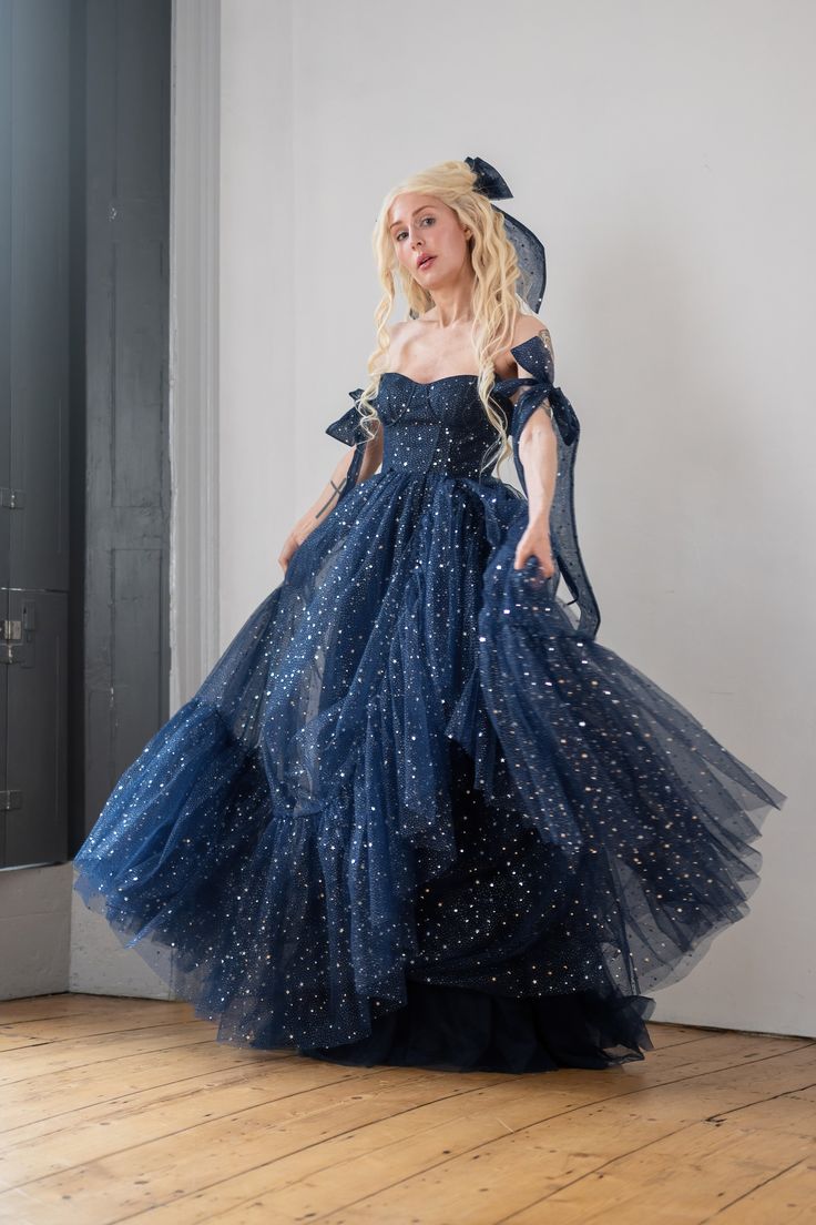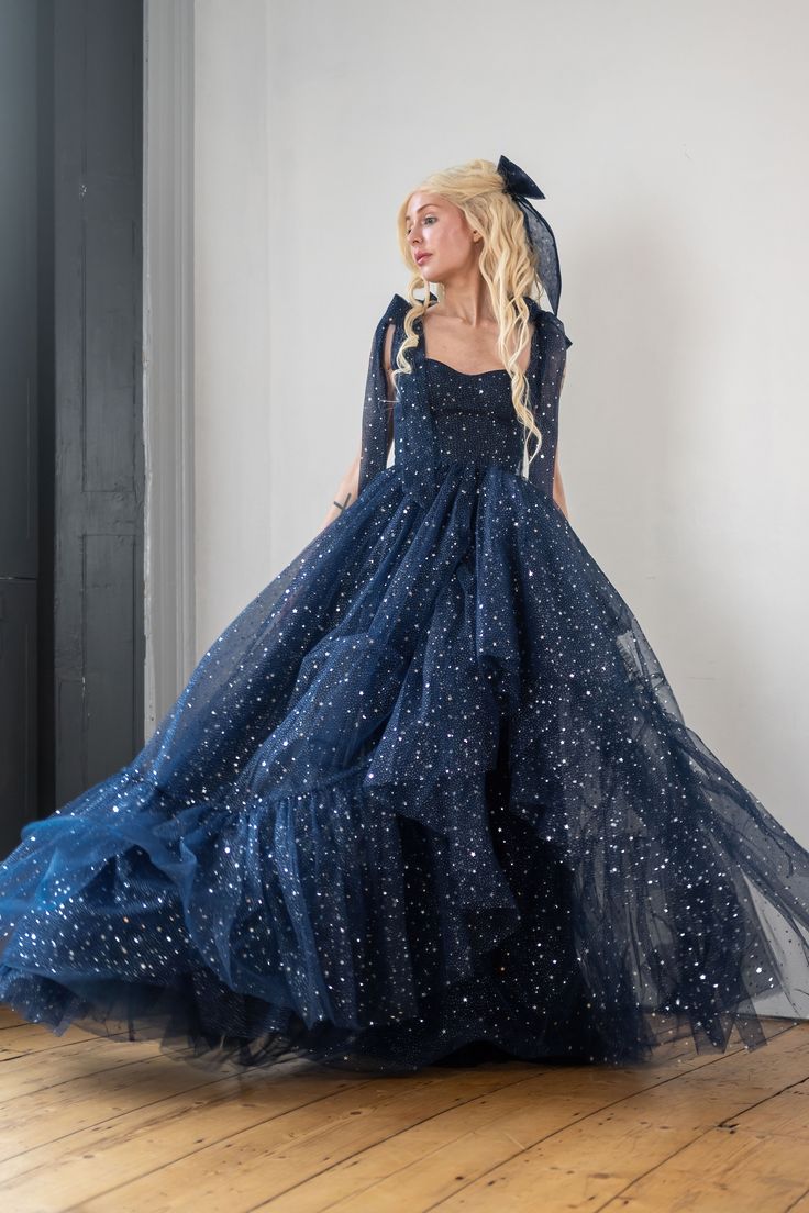 Star Sequin Navy Blue A Line Straps Layered Tulle Date Dress Prom Dress Evening Dress HZ1023