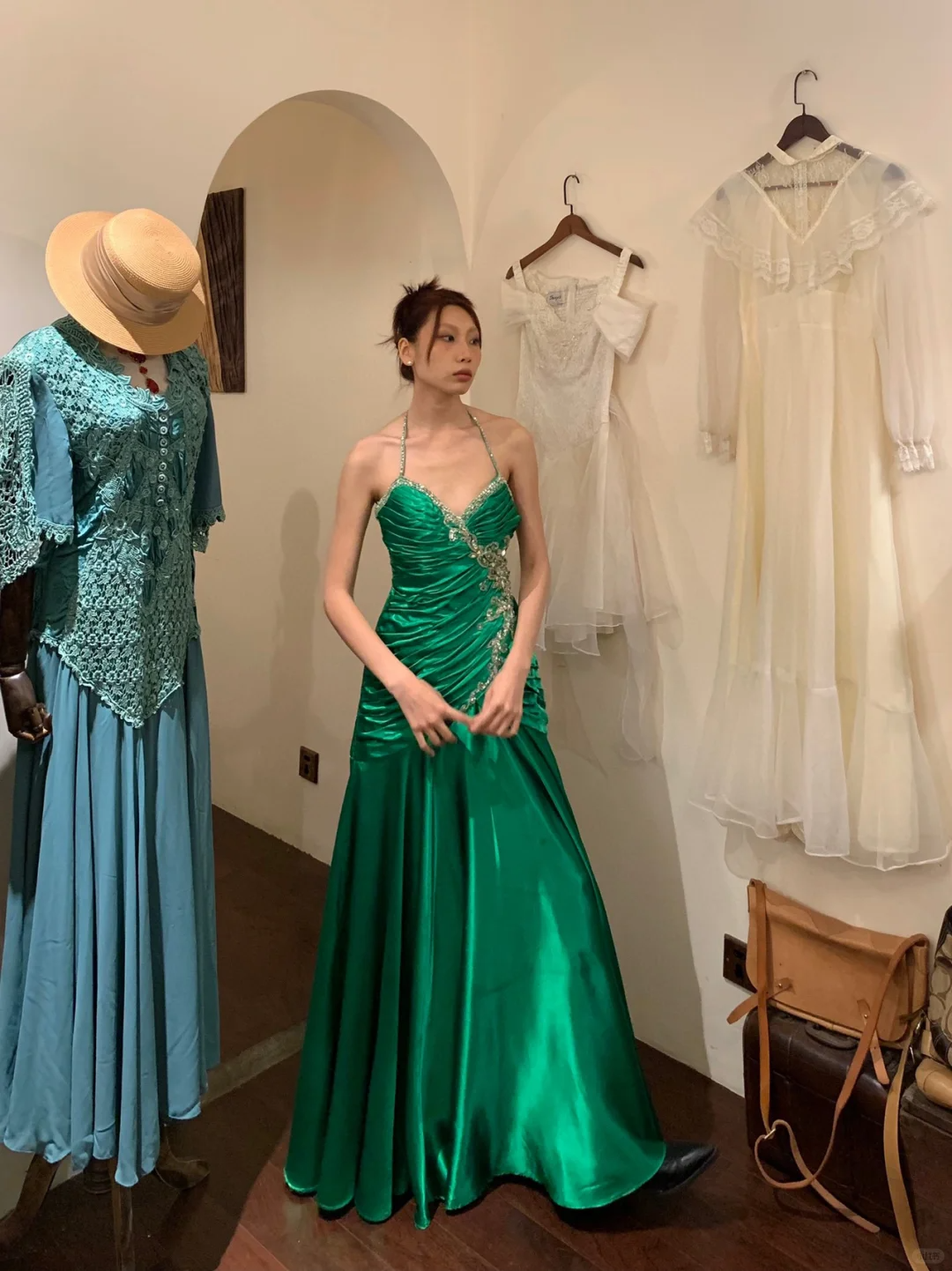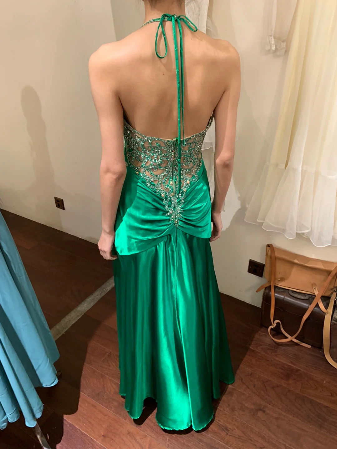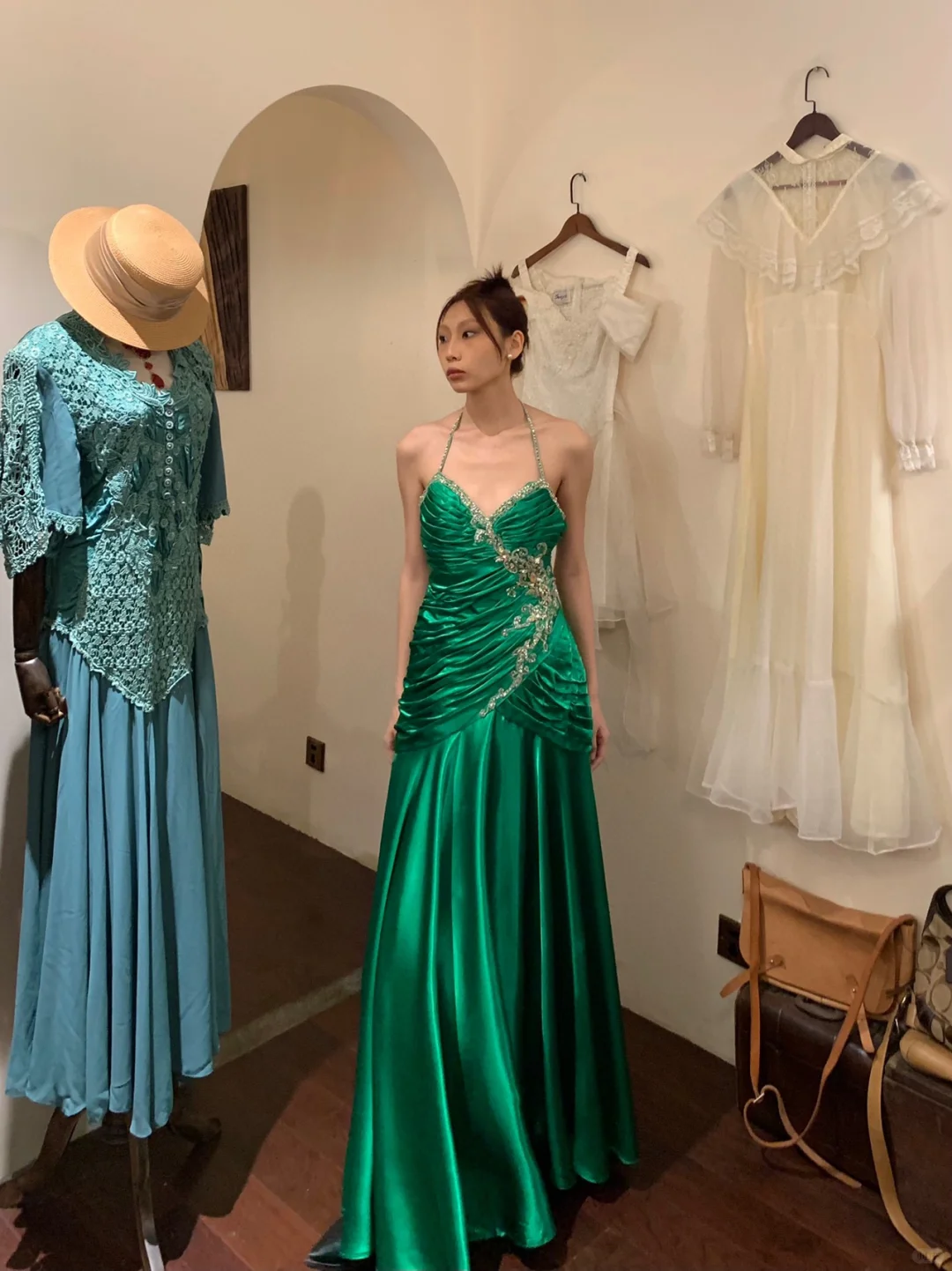 Vintage A Line Halter Pleated Beaded Sequin Emerald Satin Open Back Prom Dress Evening Dress HZ1023