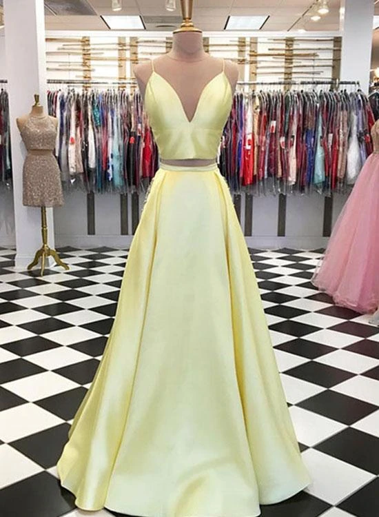 Yellow two pieces long prom dress, yellow satin evening dress HZ1023