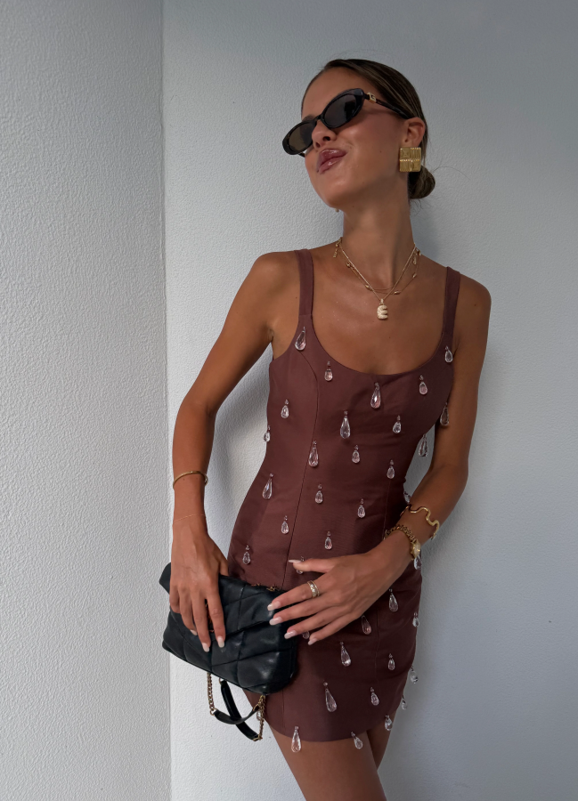 Cute Sheath Straps Crystal Brown Satin Short Homecoming Dress Outfits HZ1023