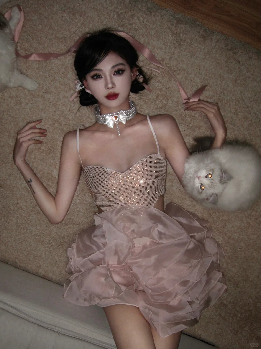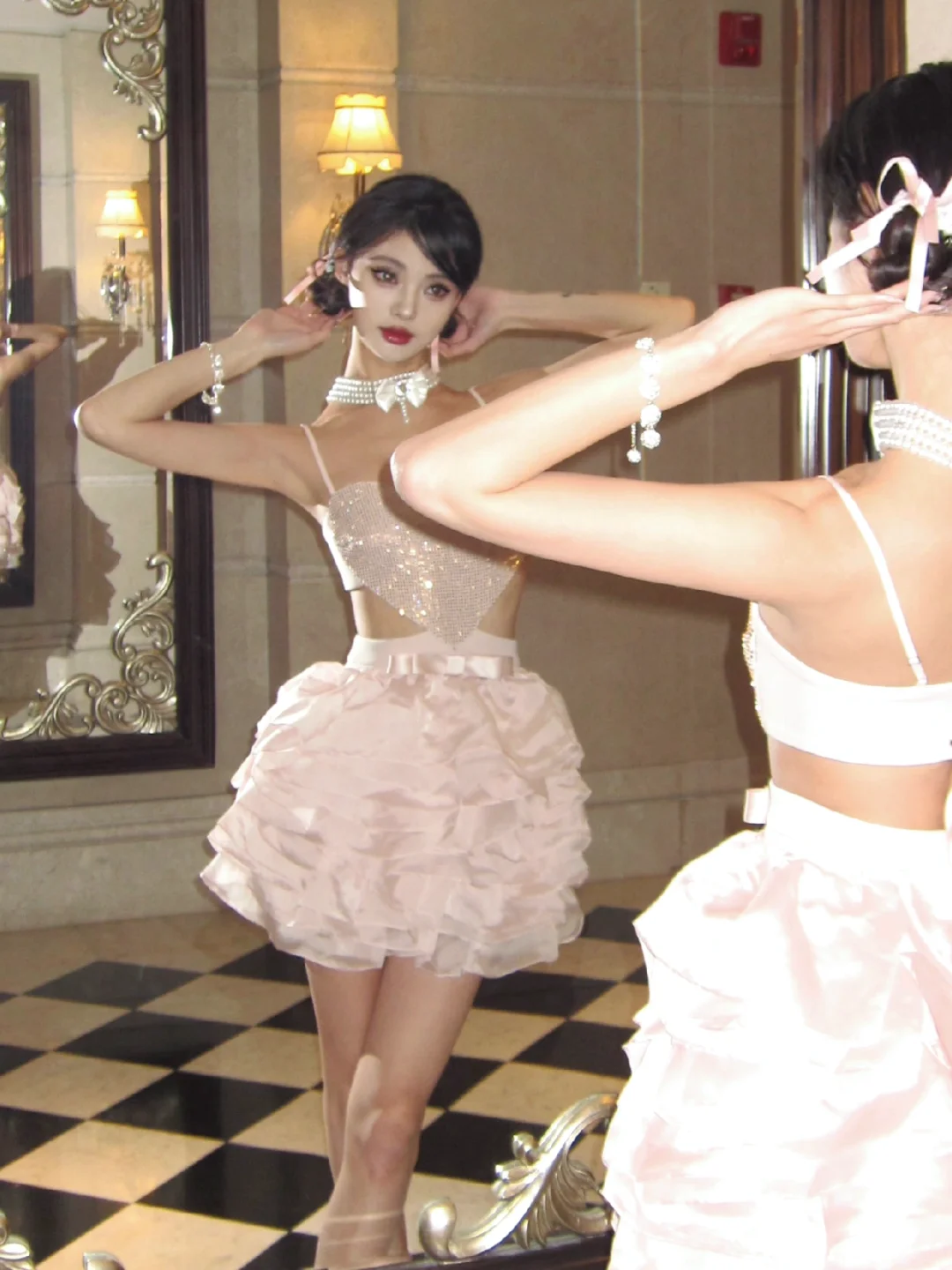 Pink Sequin A Line Spaghetti Strap Layered Organza Short Homecoming Dress Birthday Dress HZ1023
