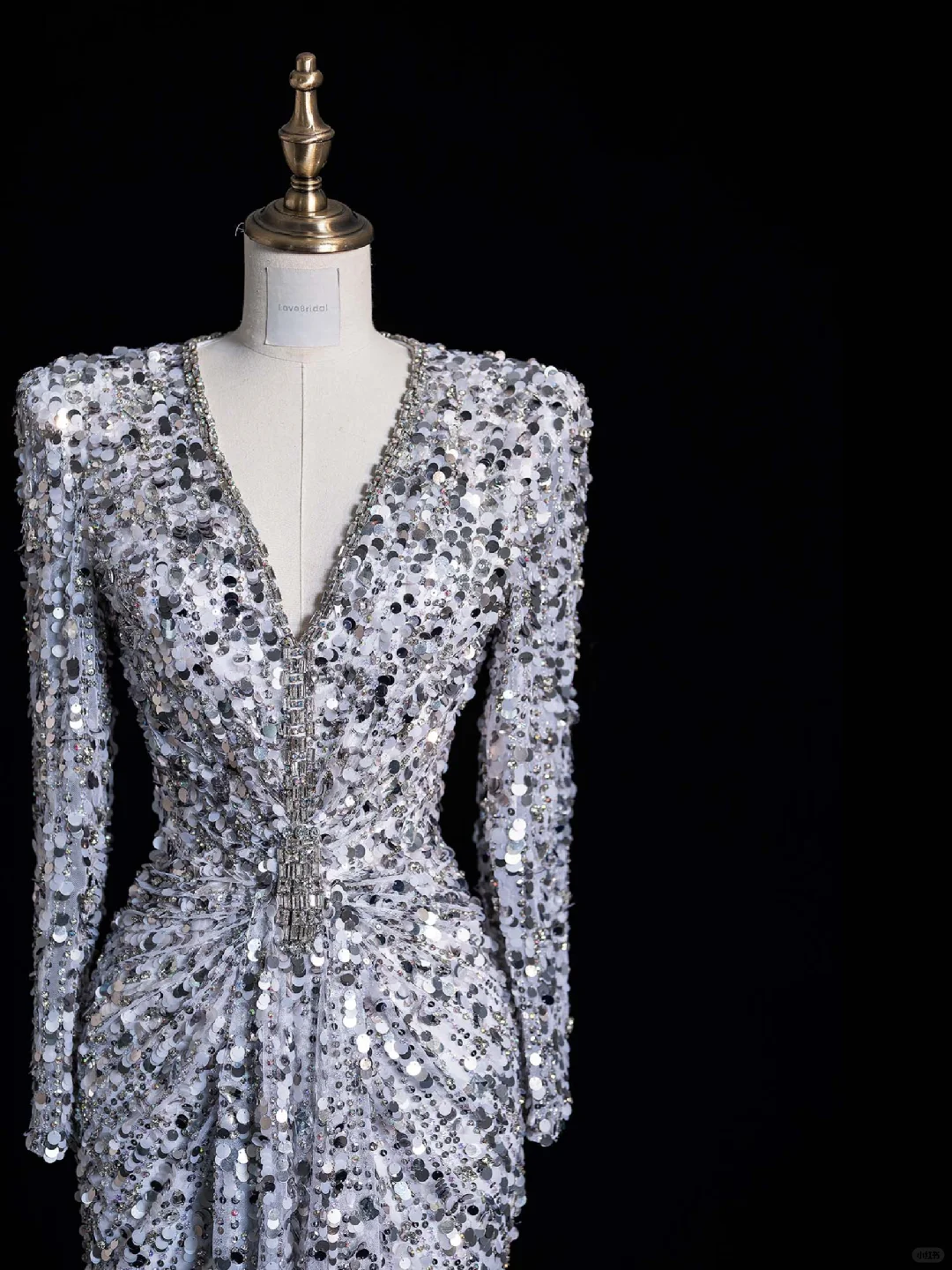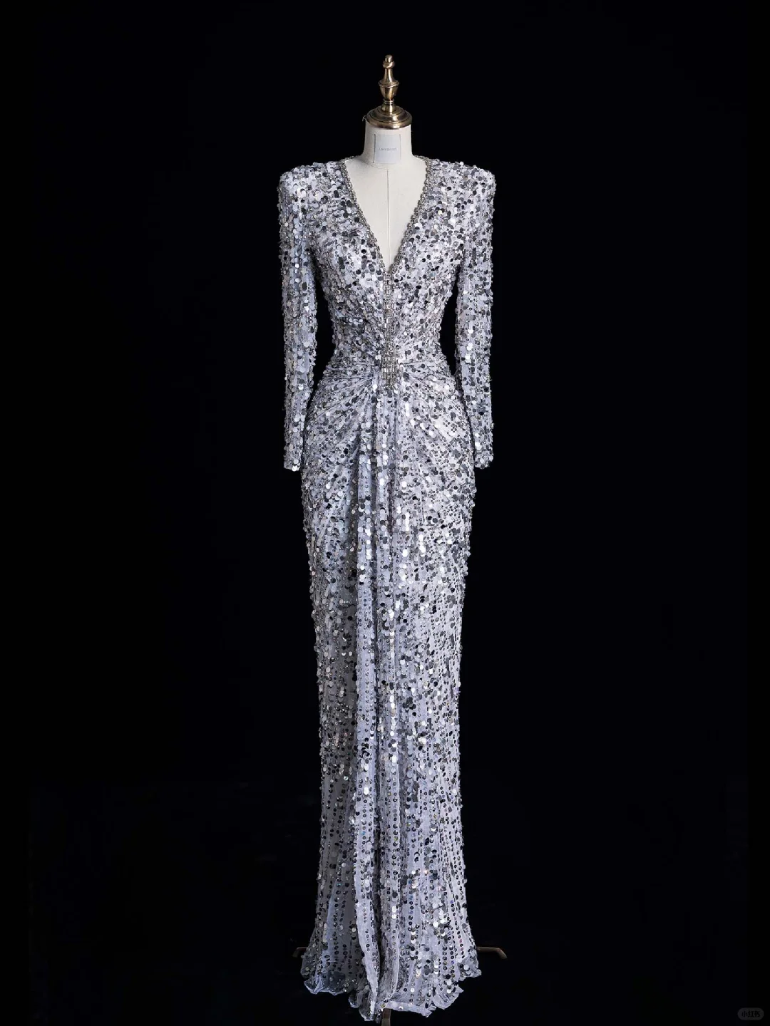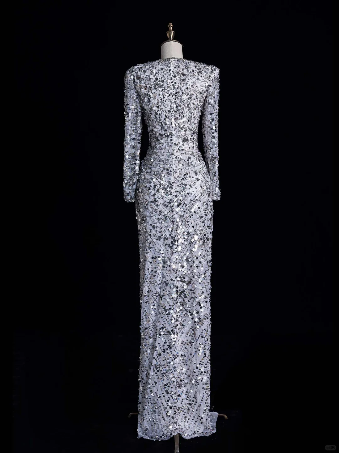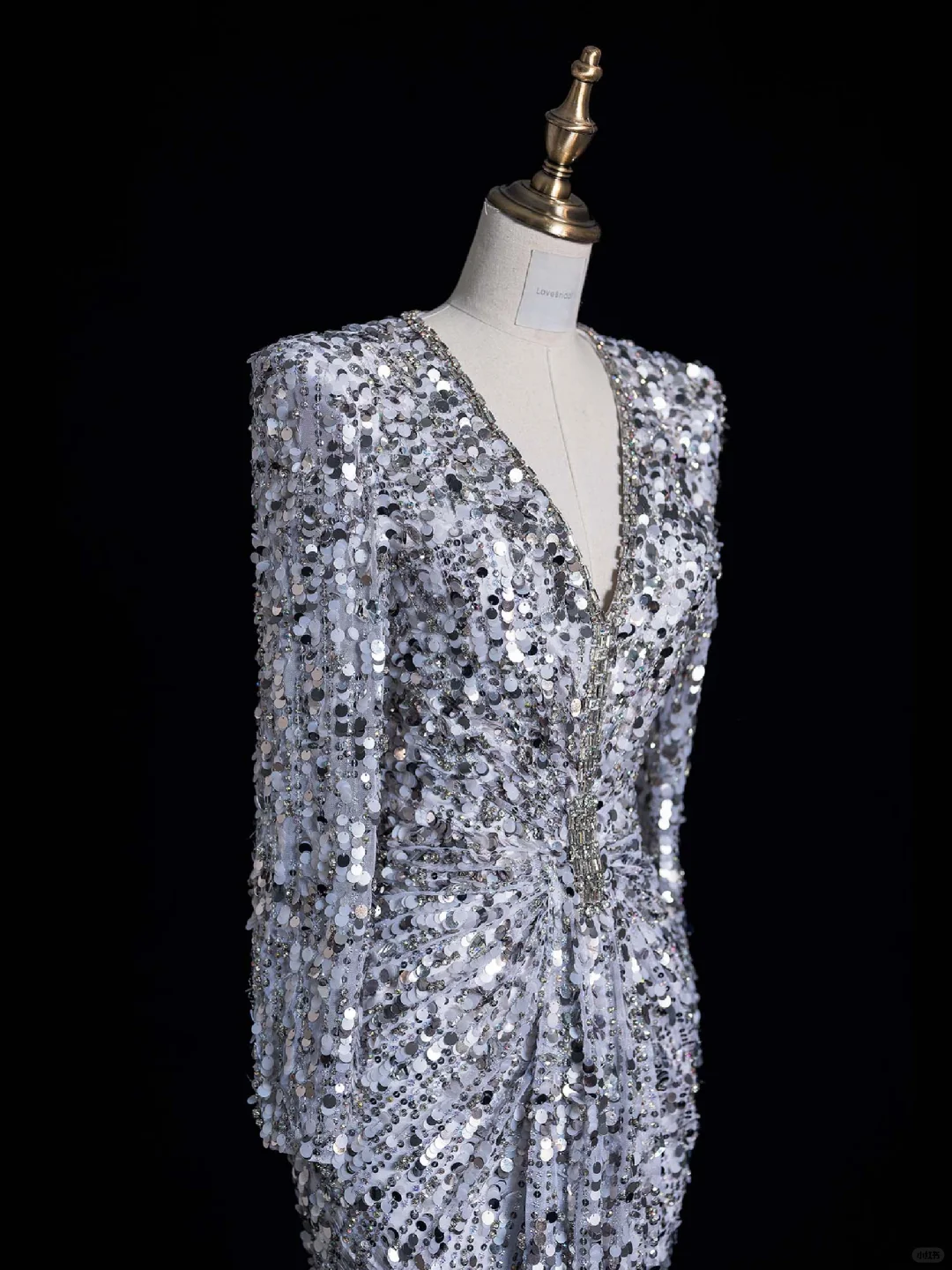 Stunning Sheath V Neck Long Sleeve Sliver Sequin Prom Dress Graduation Prom Dress HZ1023