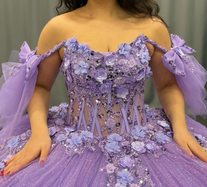 Purple Ball Gown Off the Shoulder Beaded 3D Flowers Sweet 16 Dress Girls Party Gowns vestidos de quincea?era HZ1023