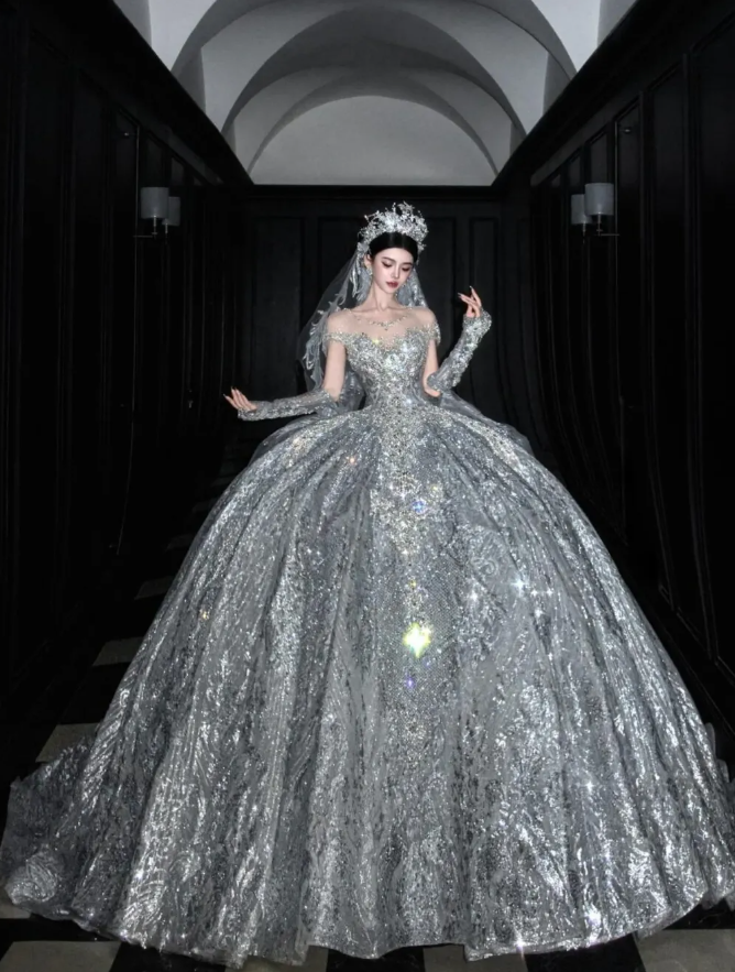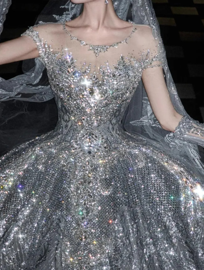 Silver Sequin Ball Gown Round Neck Prom Dress Evening Dress Party Dress HZ1023