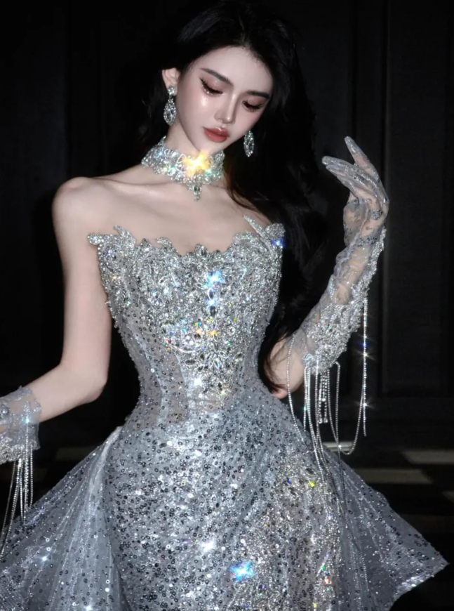 Silver Sequin Shiny Ball Gown Strapless Long Sweep Prom Dress Evening Dress Party Dress HZ1023