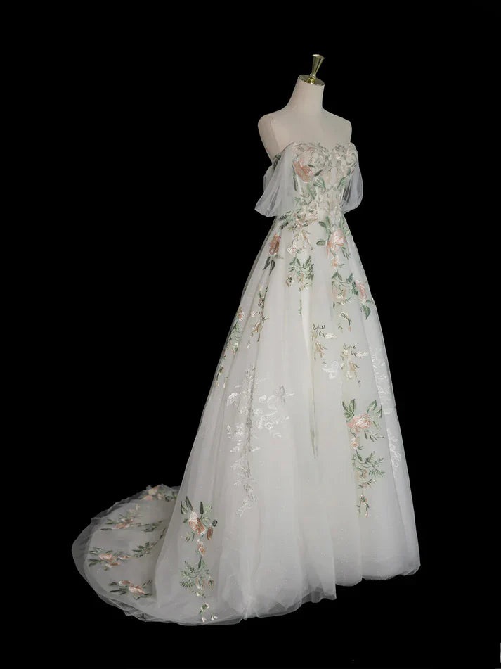 A Line Off Shoulder Tulle Lace Applique White Long Prom Dress Formal Dress HZ1023