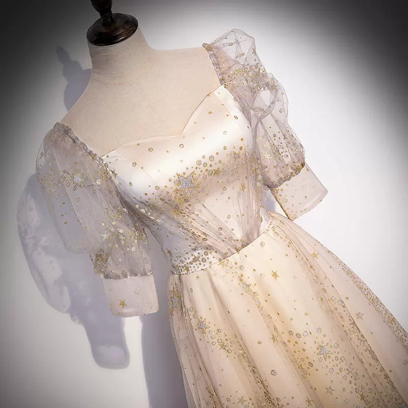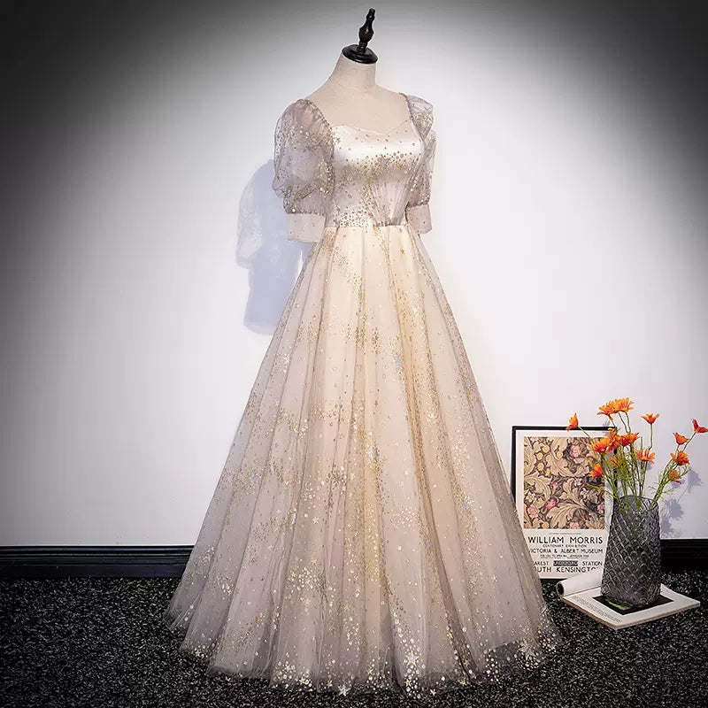 A line Short Puffy Sleeves Tulle Prom Dresses HZ1023