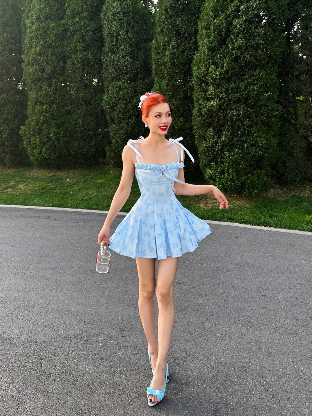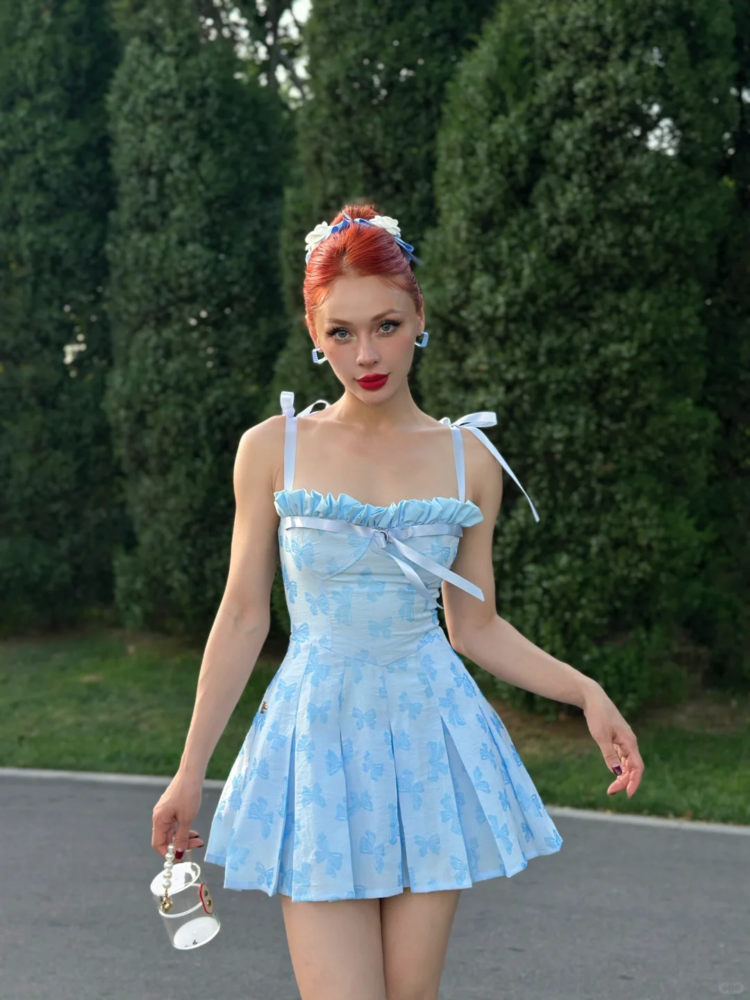 Blue A Line Spaghetti Strap Print Floral Satin Party Dress Homecoming Dress HZ1023