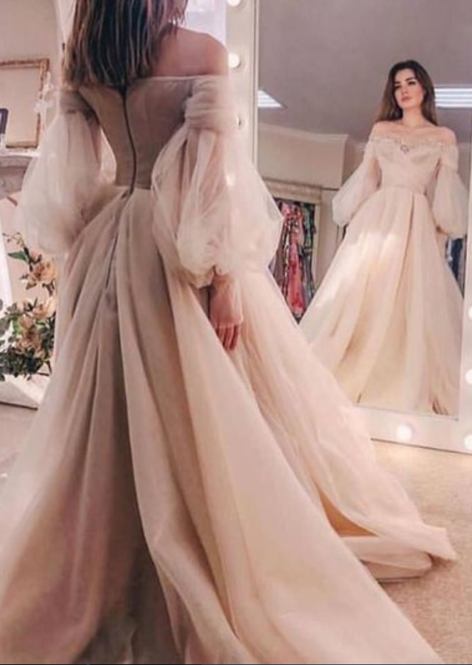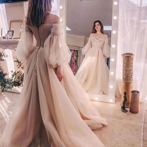 champagne prom dresses long sleeve a line tulle off the shoulder crystal evening dresses HZ1023