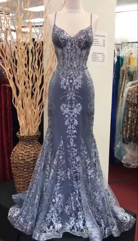 Charming V Neck Lace Mermaid Prom Dress Long Evening Dress HZ1023