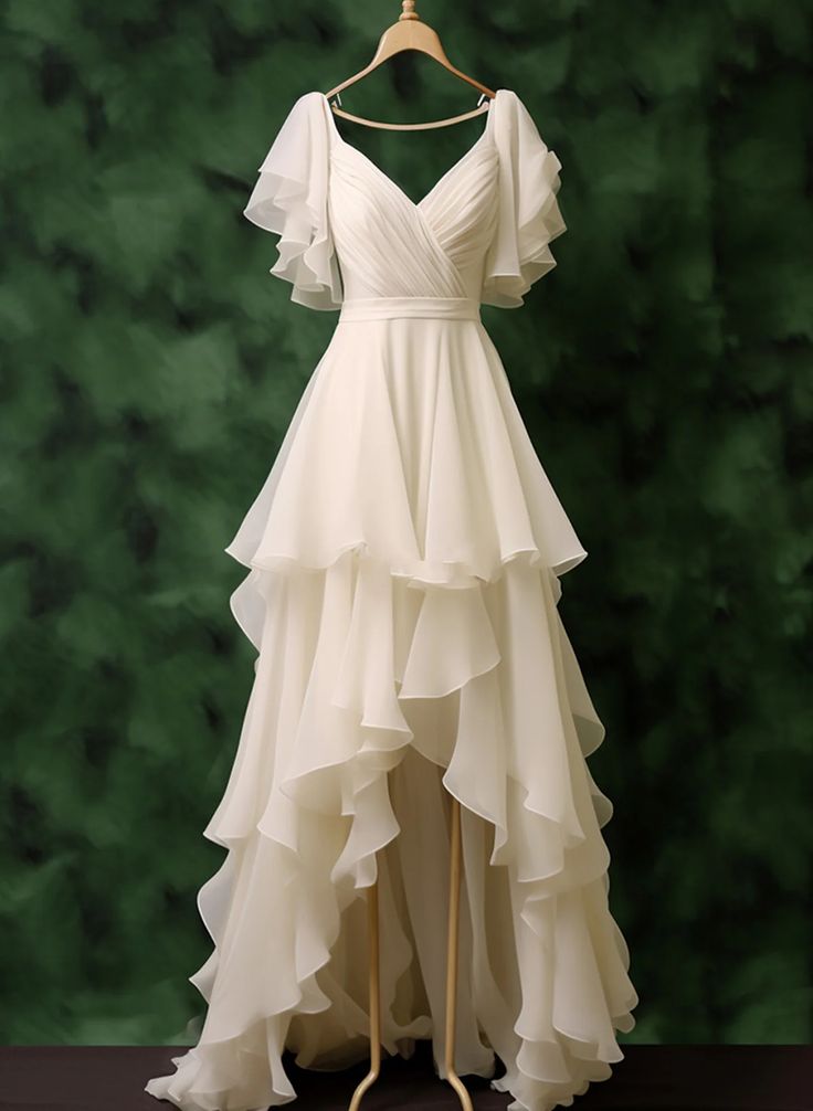 Classic A Line V Neck White Ruffle Chiffon Prom Dress Party Dress HZ1023