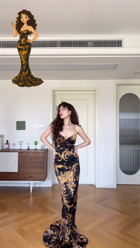 Classic Mermaid Spaghetti Strap Printed Floral Black Satin Prom Dress Wedding Guest Dress HZ1023