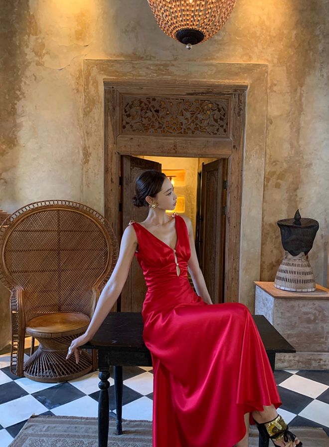 Classic Red A Line V Neck Satin Long Prom Dress Party Dress HZ1023