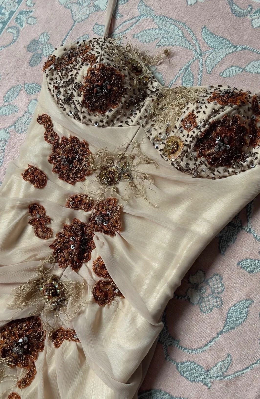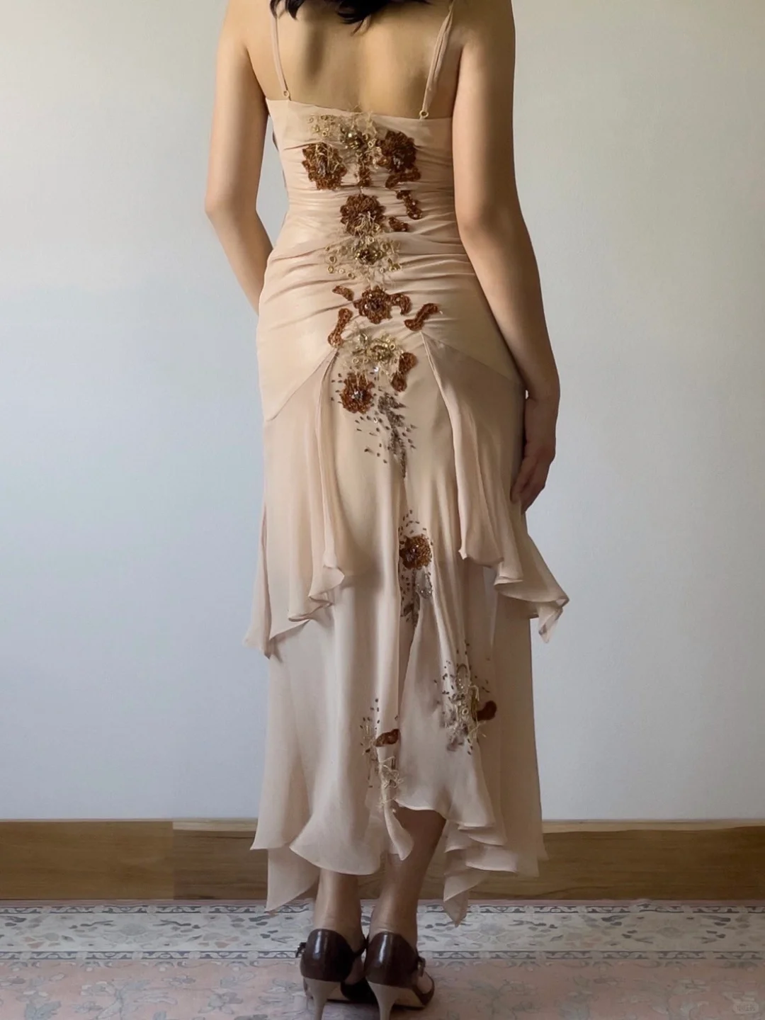 Dark Apricot Mermaid Spaghetti Strap Beaded Chiffon Prom Dress Evening Dress HZ1023
