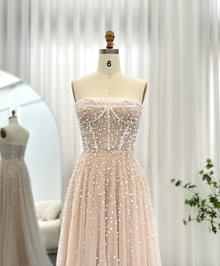 Elegant A Line Strapless Sequin Pearl Beaded Tulle Long Prom Dress Evening Dress HZ1023