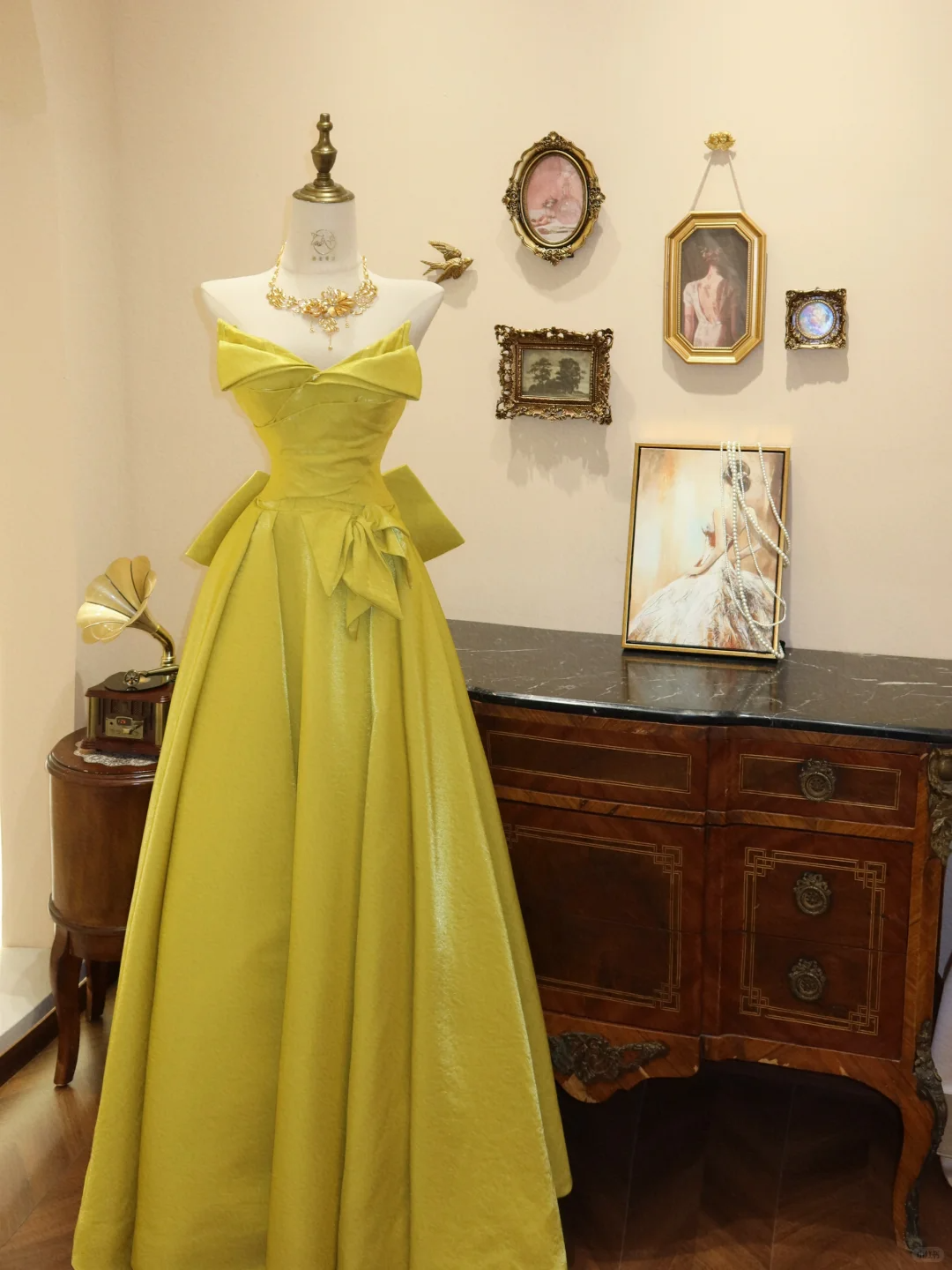 Elegant A Line Strapless Yellow Satin Long Prom Dress Evening Dress with Bow HZ1023