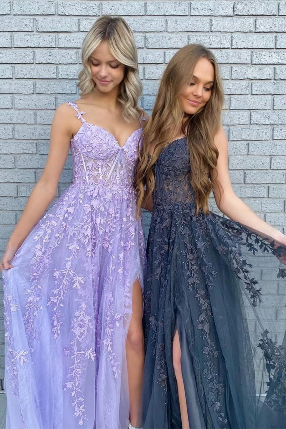 Elegant A Line V Neck Purple/Black Tulle Lace Long Prom Dresses, Purple/Black Lace Formal Graduation Evening Dress HZ1023