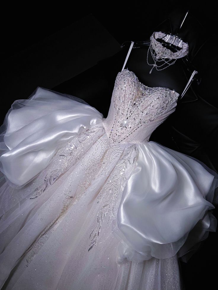 Elegant Exquisite Ball Gown Strapless Beaded Sequin Tulle Satin Prom Dress Wedding Dress HZ1023
