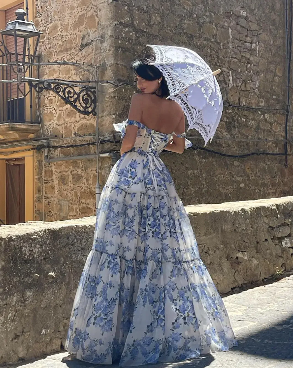 Elegant Floral Print Chiffon Long Prom Dresses Evening Dresses HZ1023