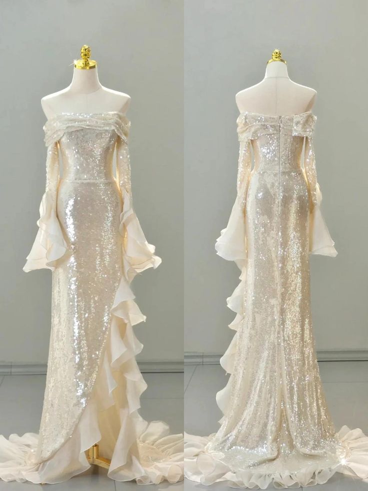 Elegant Sheath Long Sleeve Ivory Chiffon Ruffle Sequin Prom Dress Graduation Prom Dress HZ1023