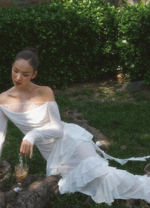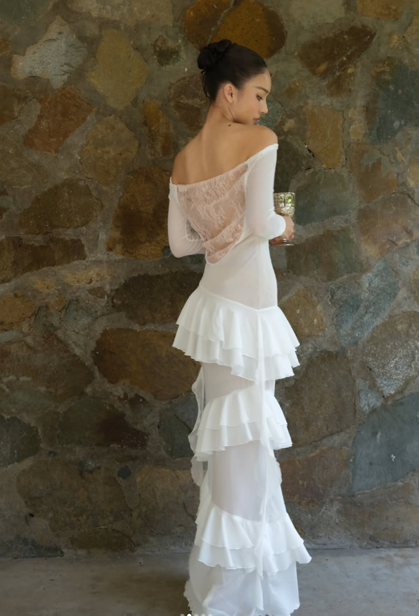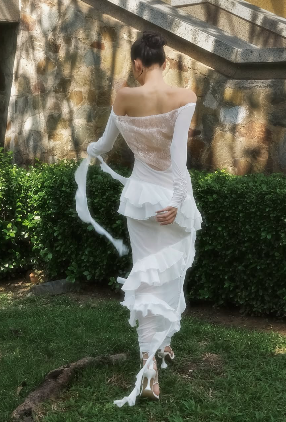Elegant Sheath Long Sleeve Ruffles White Lace Chiffon Prom Dress Evening Dress HZ1023