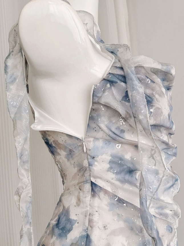 Gentle A Line Straps Blue Print Flower Chiffon Short Homecoming Dress Cocktail Dress HZ1023