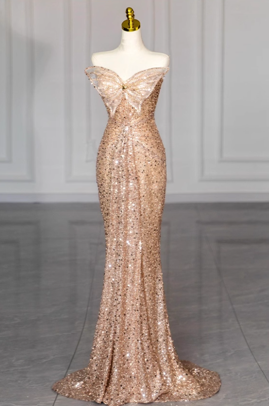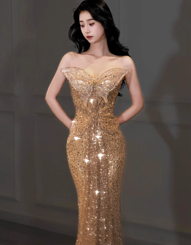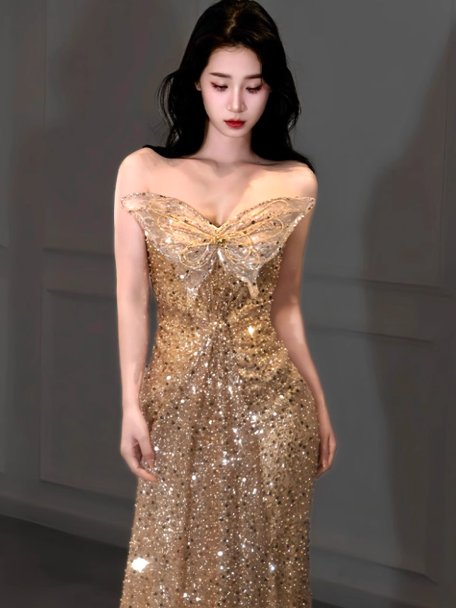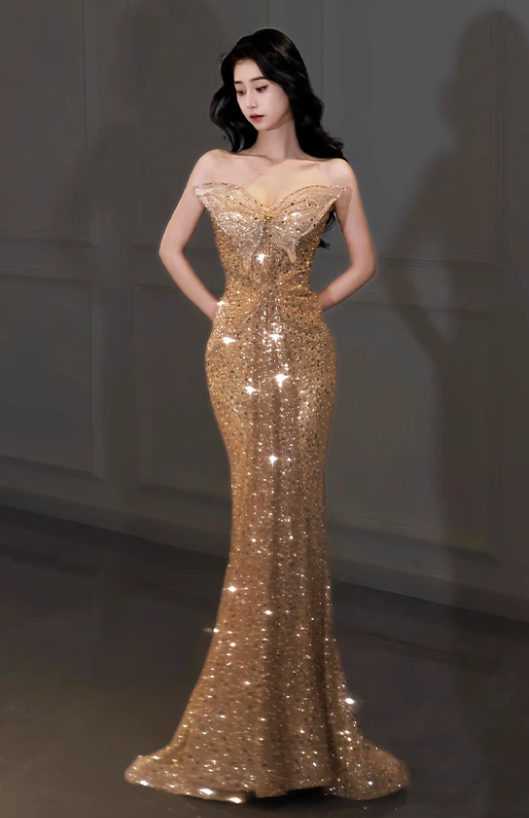 Golden Butterfly Mermaid Strapless Sequin Prom Dress Party Dress HZ1023