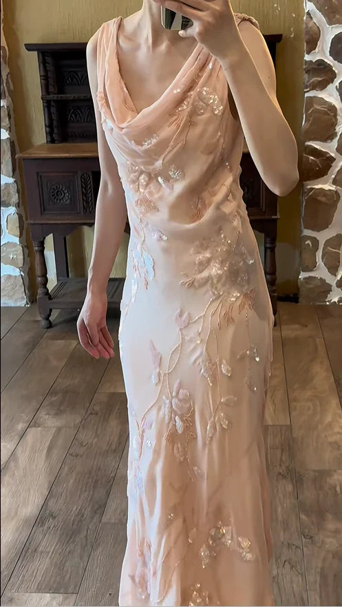 Light Pink Mermaid Round Neck Beaded Floral Chiffon Evening Dress Party Dress HZ1023
