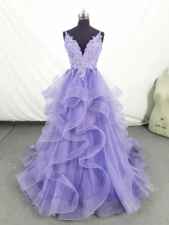 Lilac Tull Lace Applique Ball Gown Straps Long Prom Dress Elegant Evening Dress HZ1023