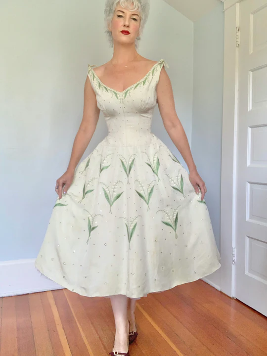 Lily of the Valley Embroidery Exquisite V Neck Satin Party Dress Prom Dress HZ1023