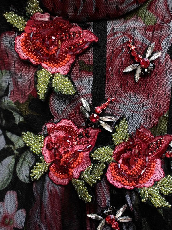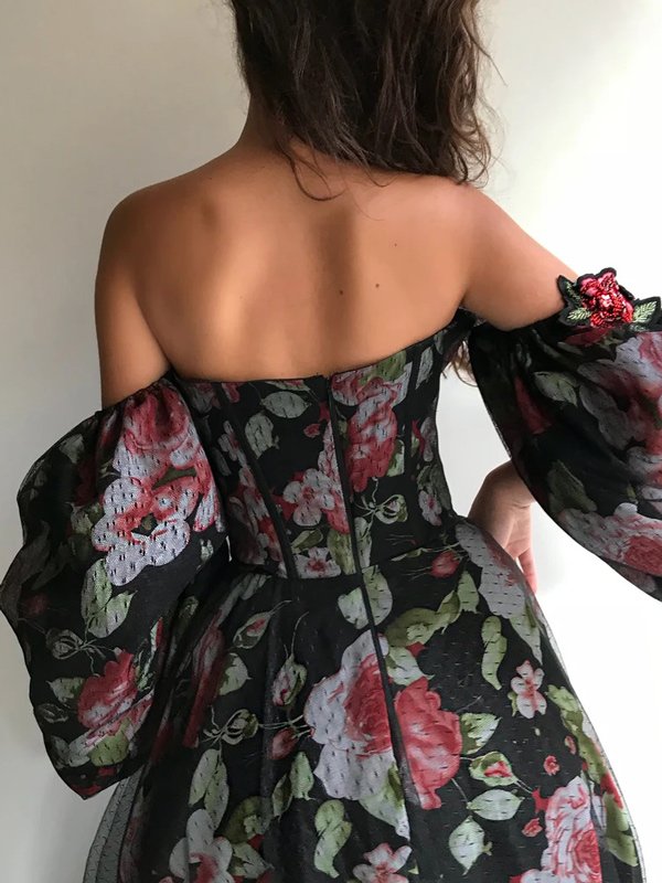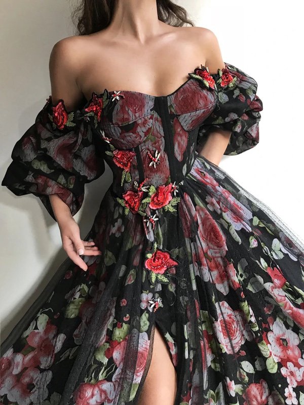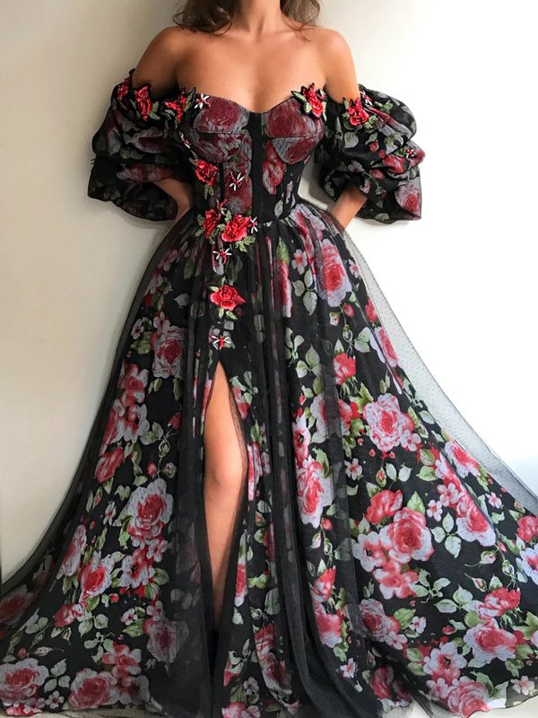 Off-The-Shoulder Beaded Decorate Floral Print Mesh Split-Side Prom Dress Long Evening Dress HZ1023