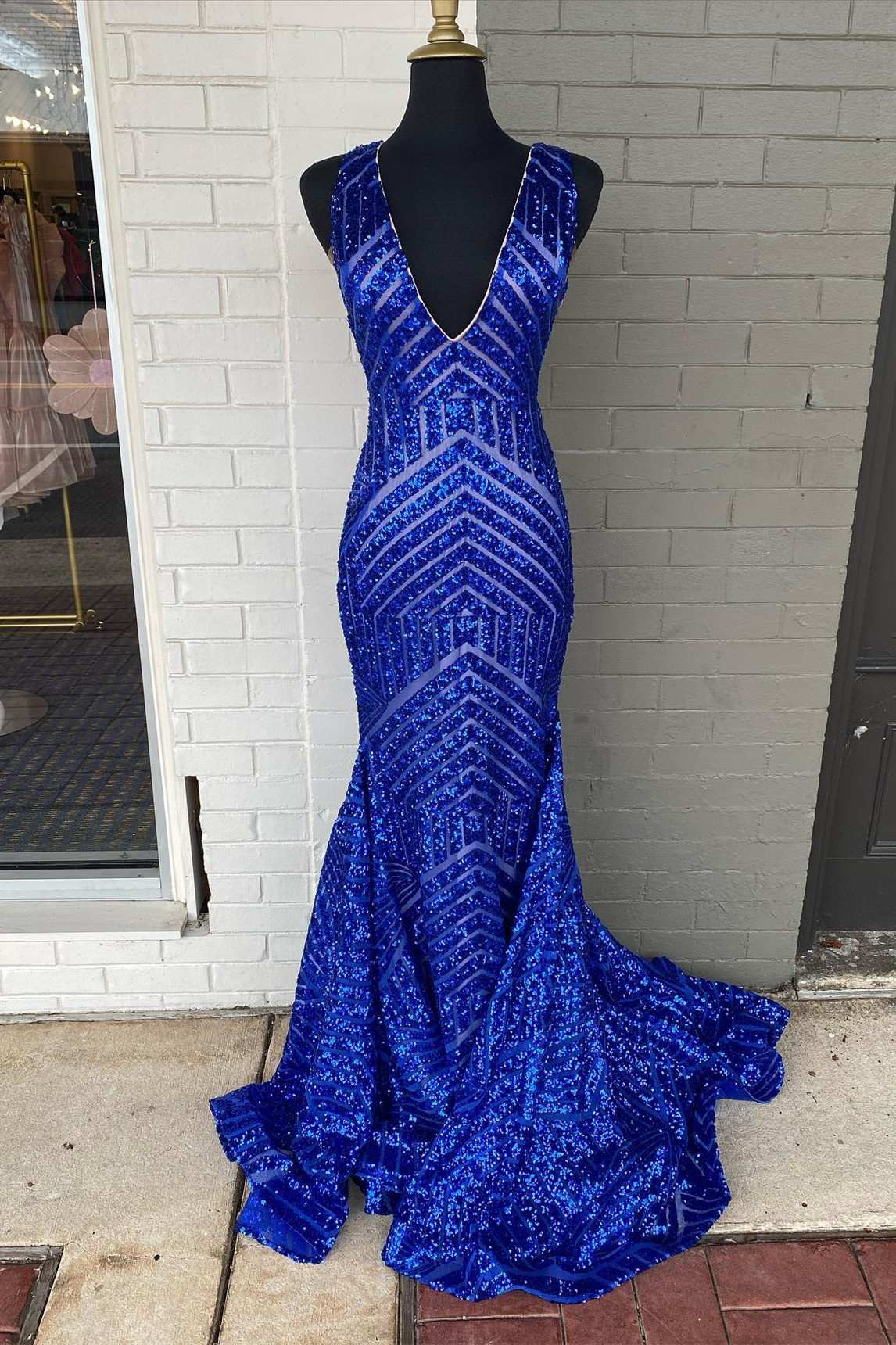 Plunge Royal Blue Sequins Mermaid Long Evening Dress HZ1023