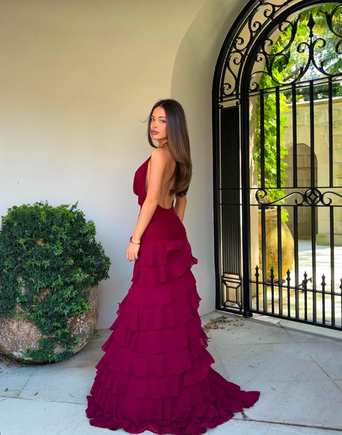 Pretty A Line V Neck Layered Chiffon Open Back Prom Dress Evening Dress HZ1023