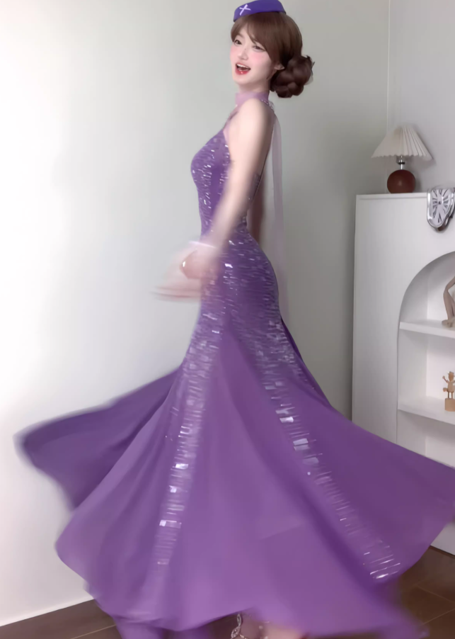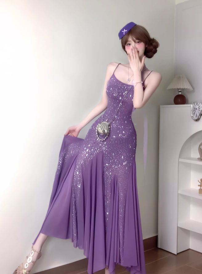 Purple Mermaid Spaghetti Strap Rhinestone Chiffon Prom Dress Vacation Dress Date Dress HZ1023