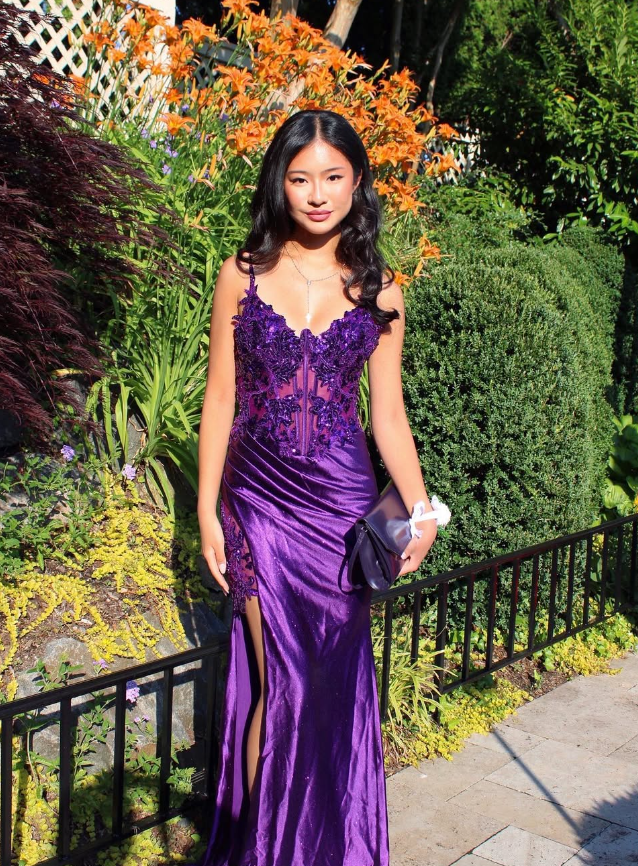 Purple Sheath Spaghetti Strap Appliques Satin Prom Dress Evening Dress with Slit HZ1023