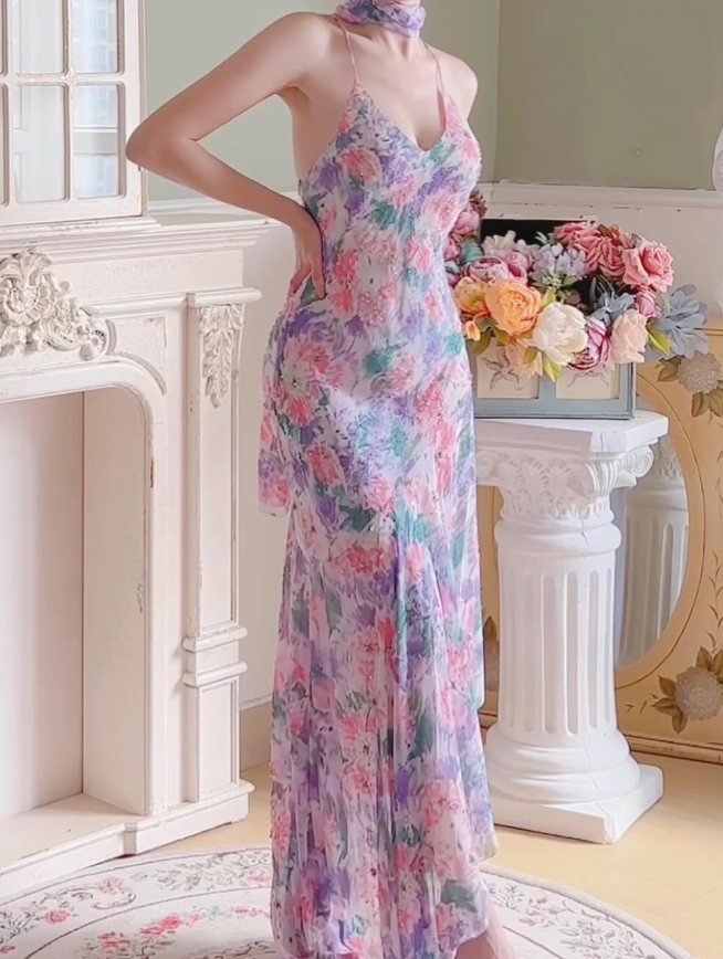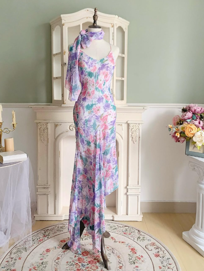 Purple Vintage Mermaid Spaghetti Strap Beaded Print Floral Chiffon Party Dress Prom Dress HZ1023