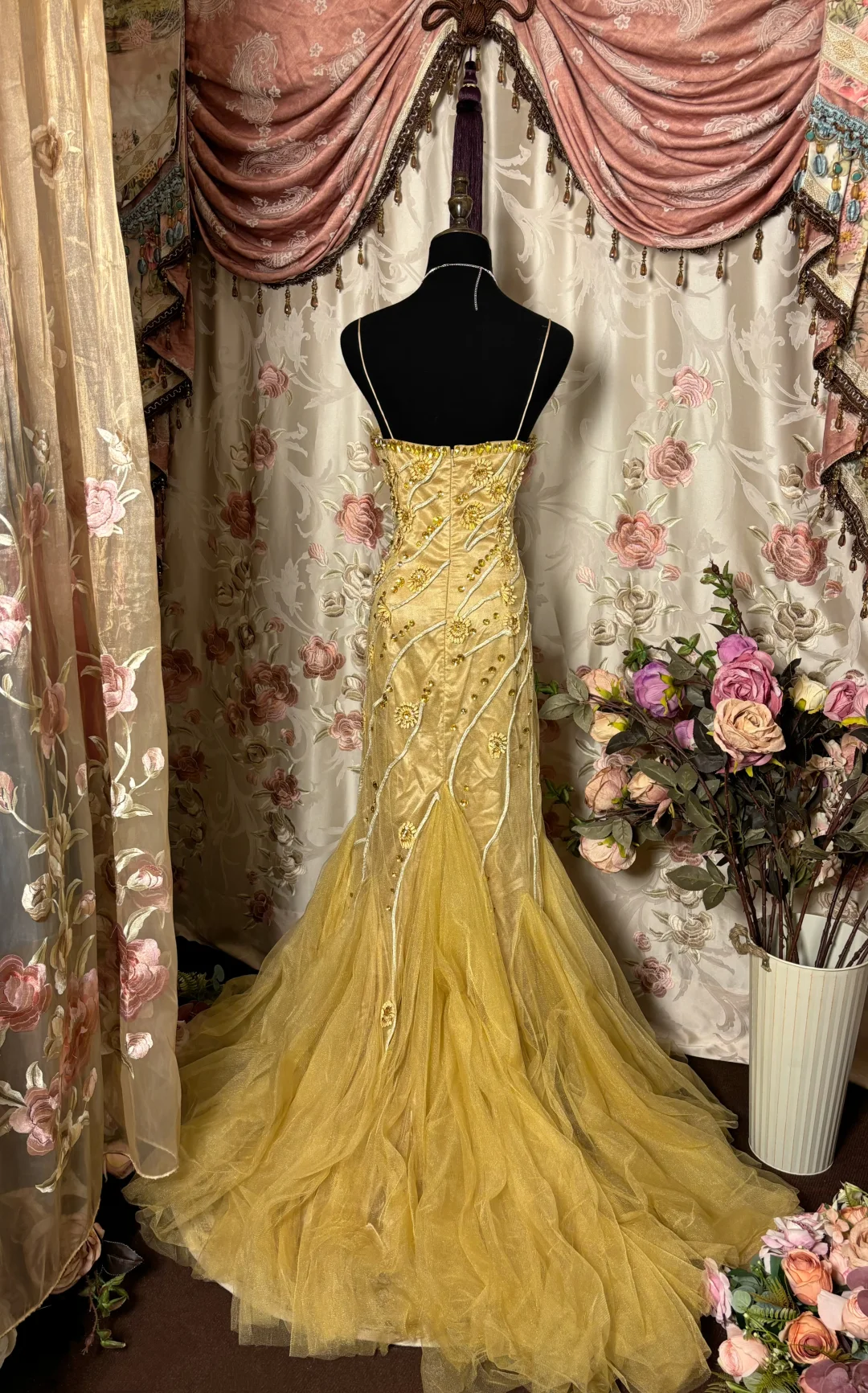Retro Gold Mermaid Spaghetti Strap Beaded Tulle Long Prom Dress Evening Dress HZ1023