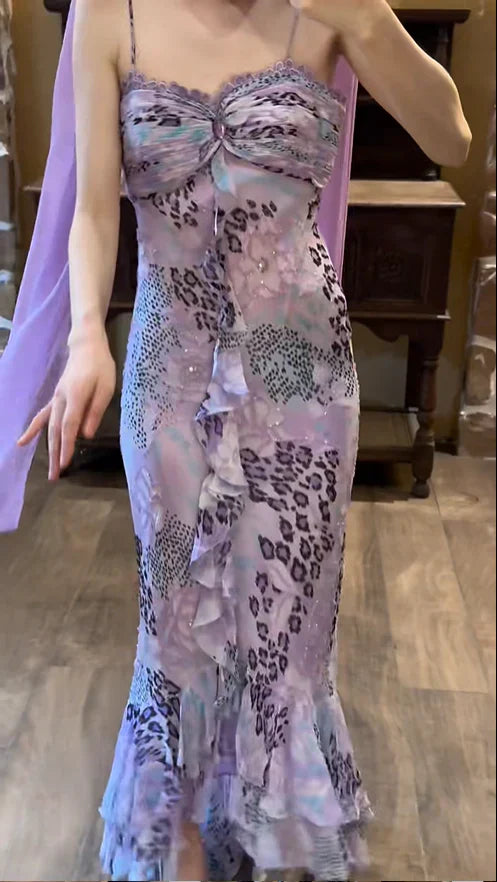 Retro Purple Leopard Mermaid Spaghetti Strap Chiffon Prom Dress Party Dress HZ1023