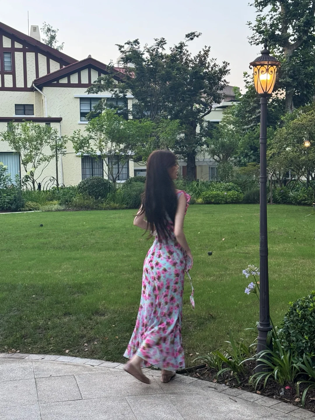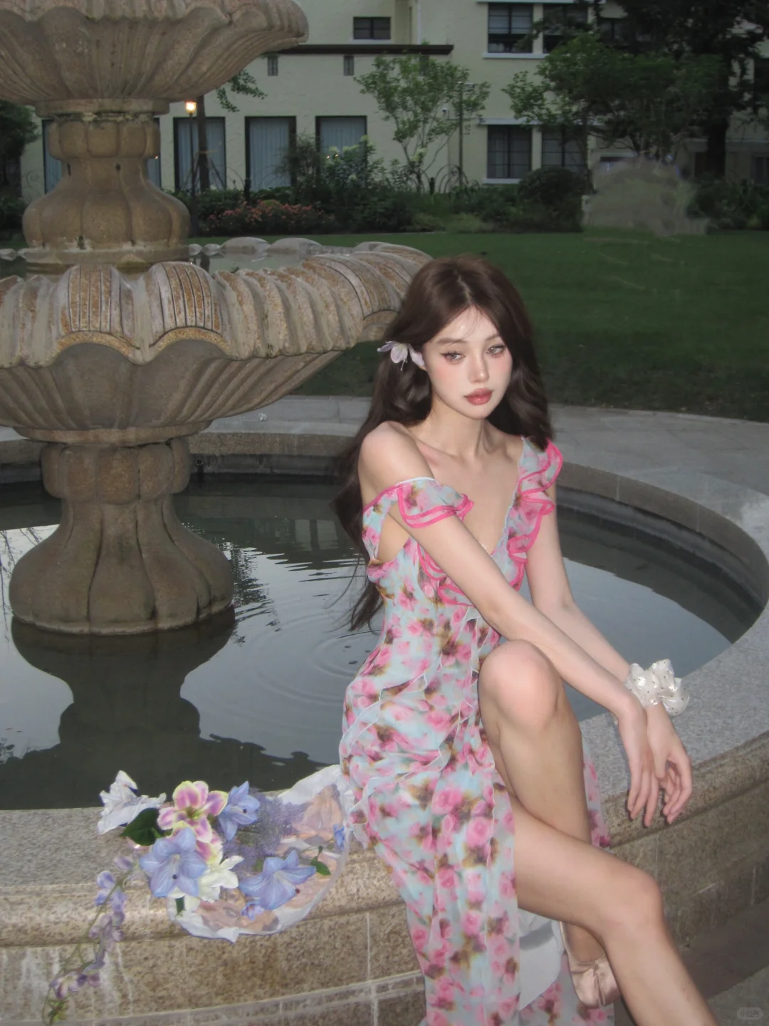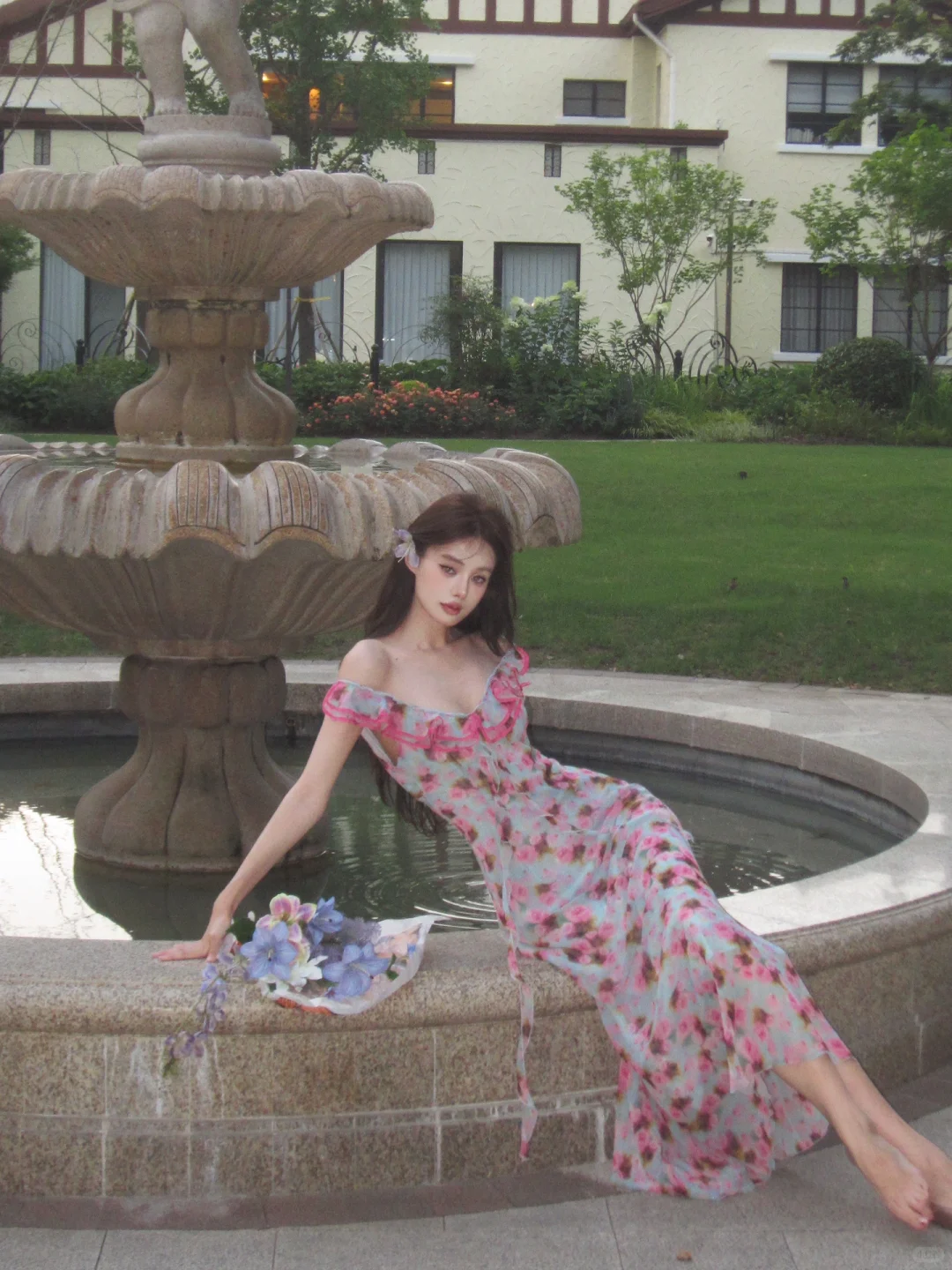 Romantic A Line Spaghetti Strap Print Floral Chiffon Prom Dress Outfits HZ1023