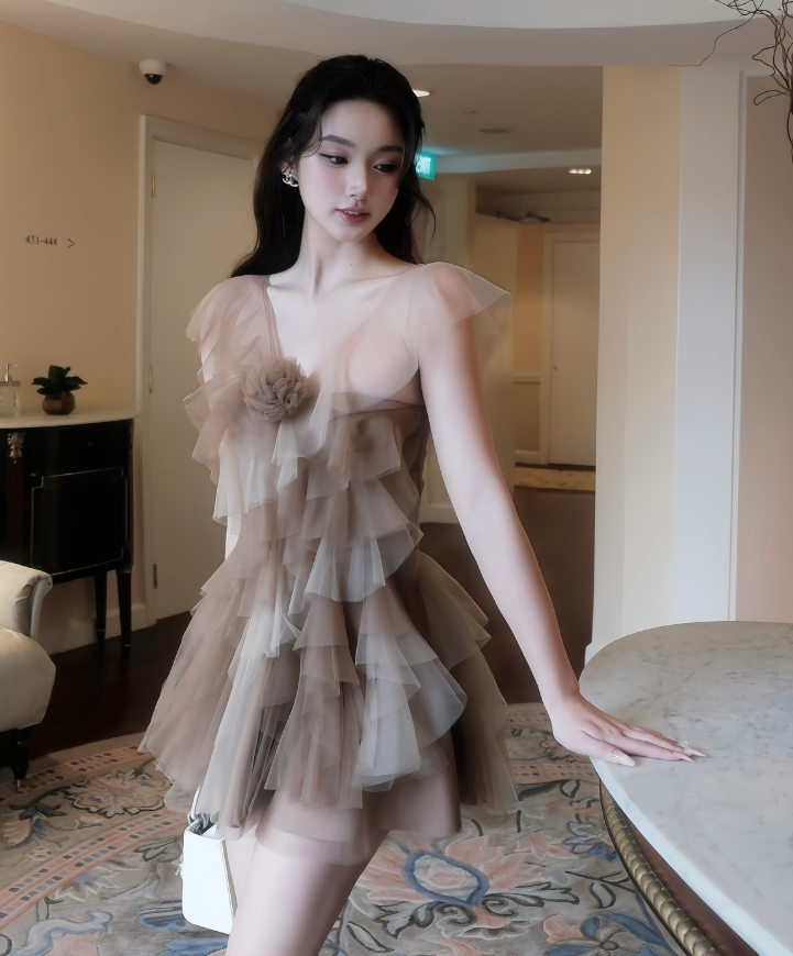 Romantic Brown A Line V Neck Layered Tulle Short Homecoming Dress Cocktail Dress HZ1023