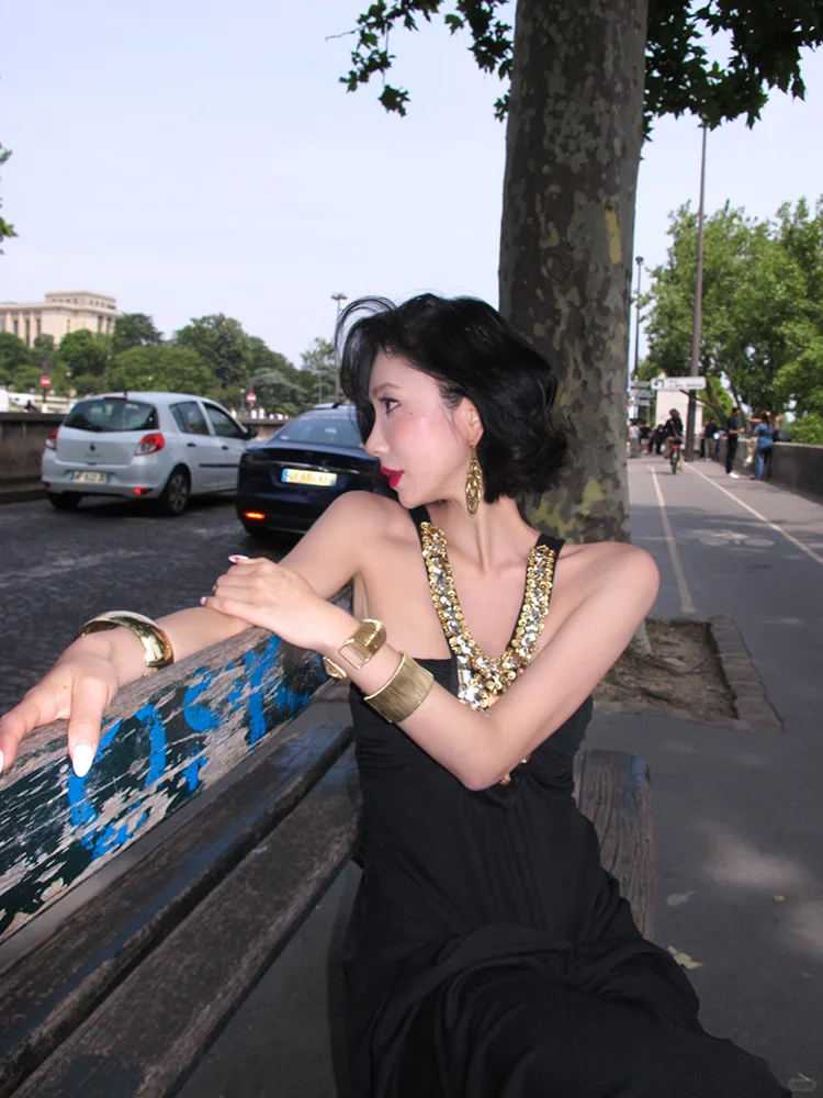 Sexy Black A Line Halter Rhinestone Satin Long Prom Dress Evening Dress HZ1023