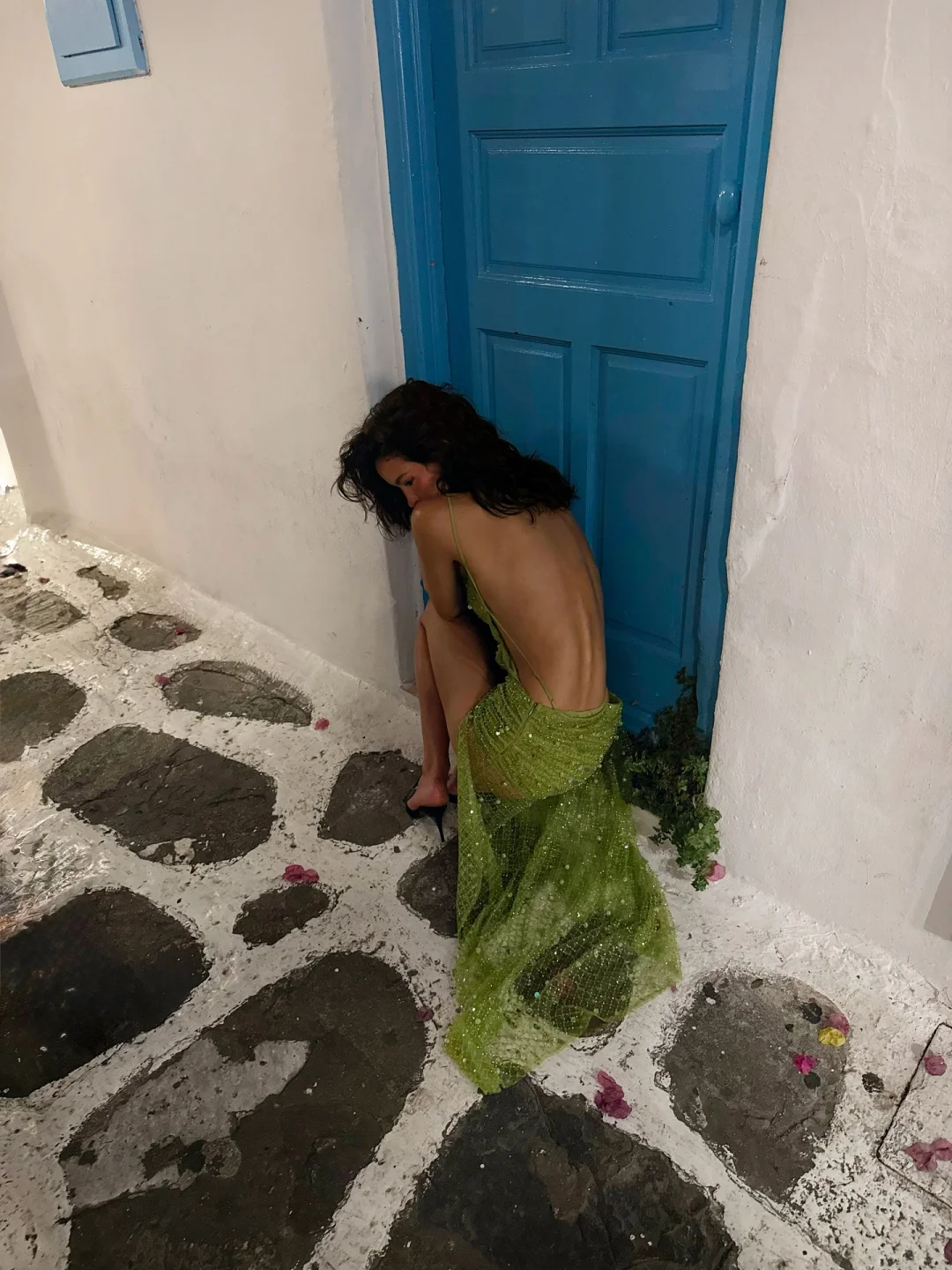Sexy Green Sheath Spaghetti Strap Beaded Tulle Prom Dress Evening Dress with Slit HZ1023