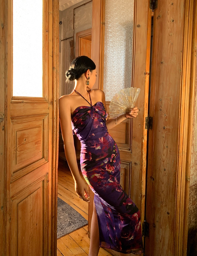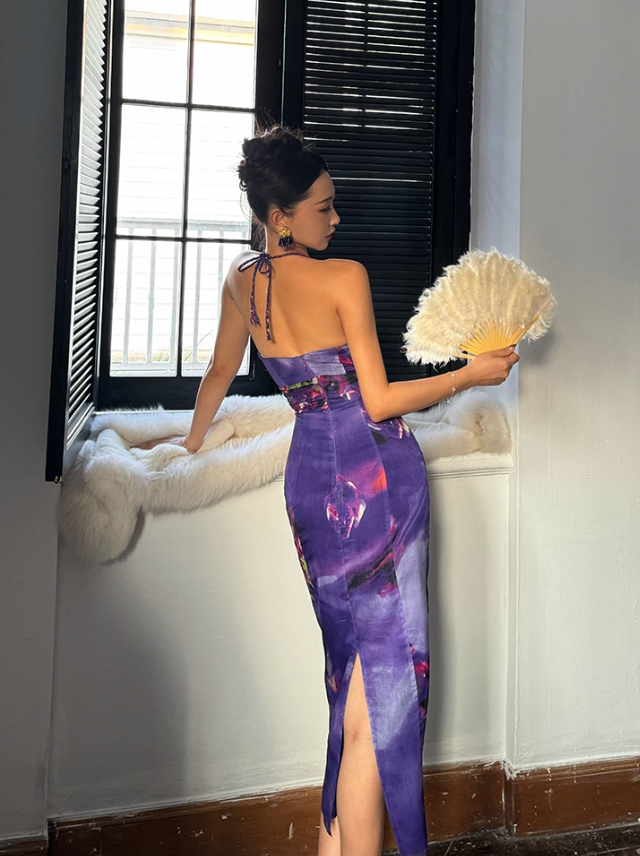 Sexy Purple Print Floral Sheath Halter Chiffon Long Prom Dress Party Dress HZ1023
